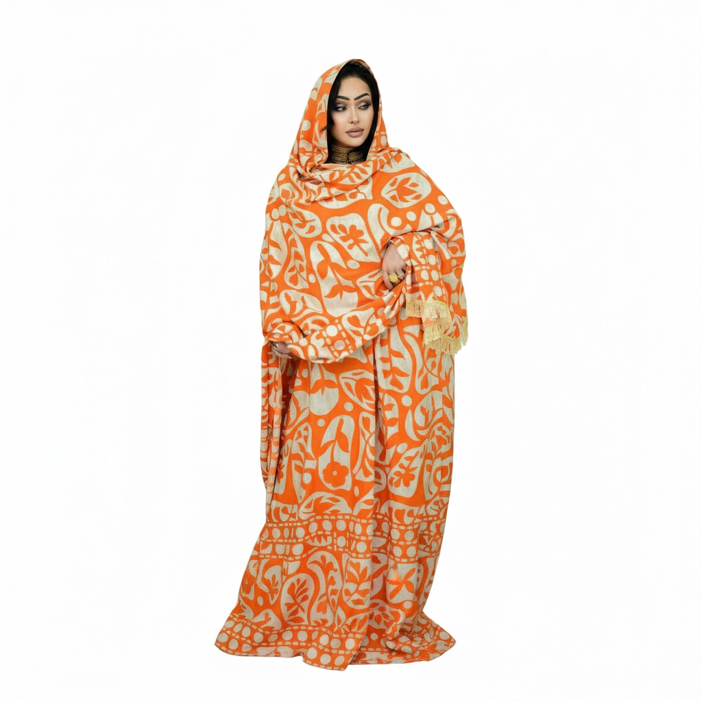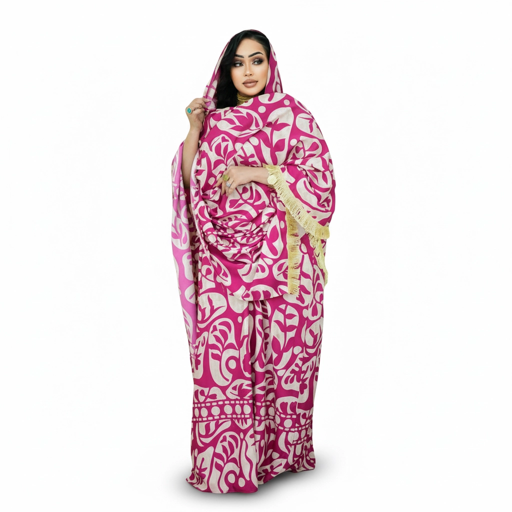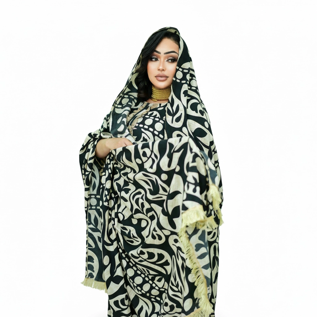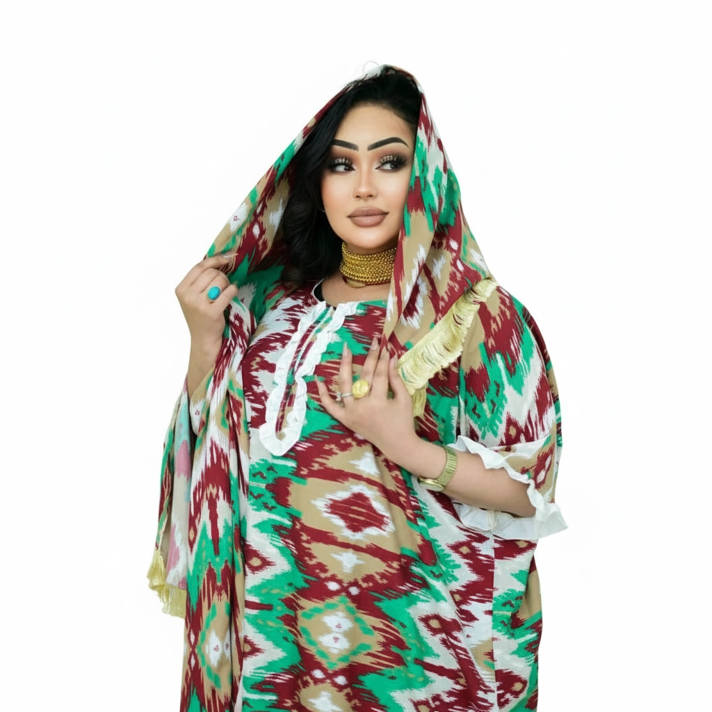 A striking African Toub luxury set featuring a long flowing dress and matching large shawl with bold African-inspired prints. Available in 13 vibrant colors.