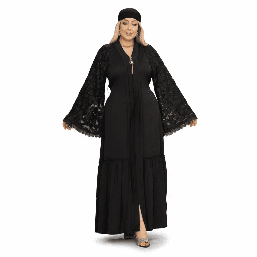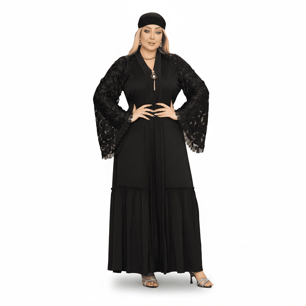 A timeless black abaya crafted from smooth silk fabric featuring wide lace sleeves for everyday elegance.