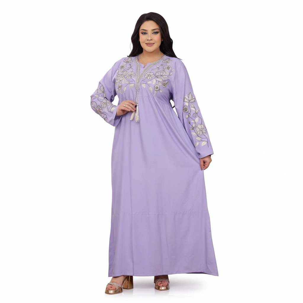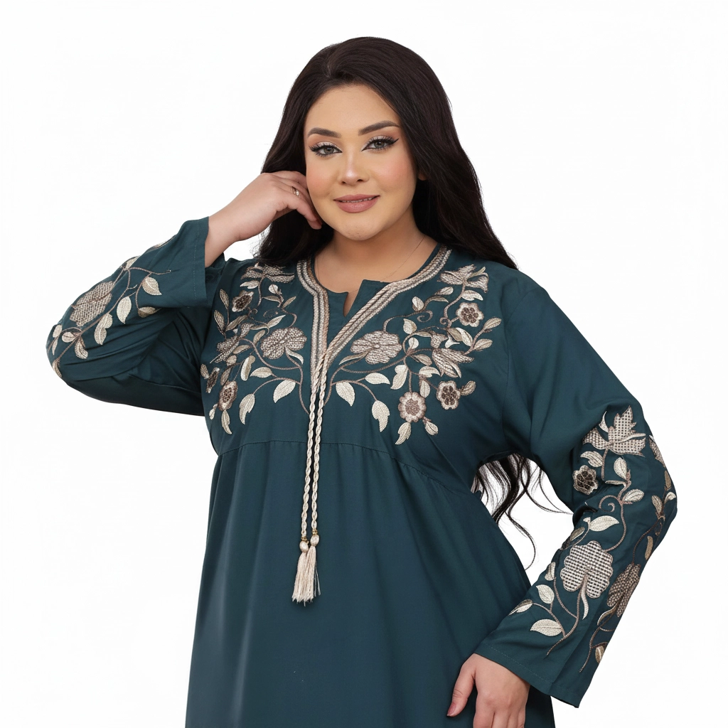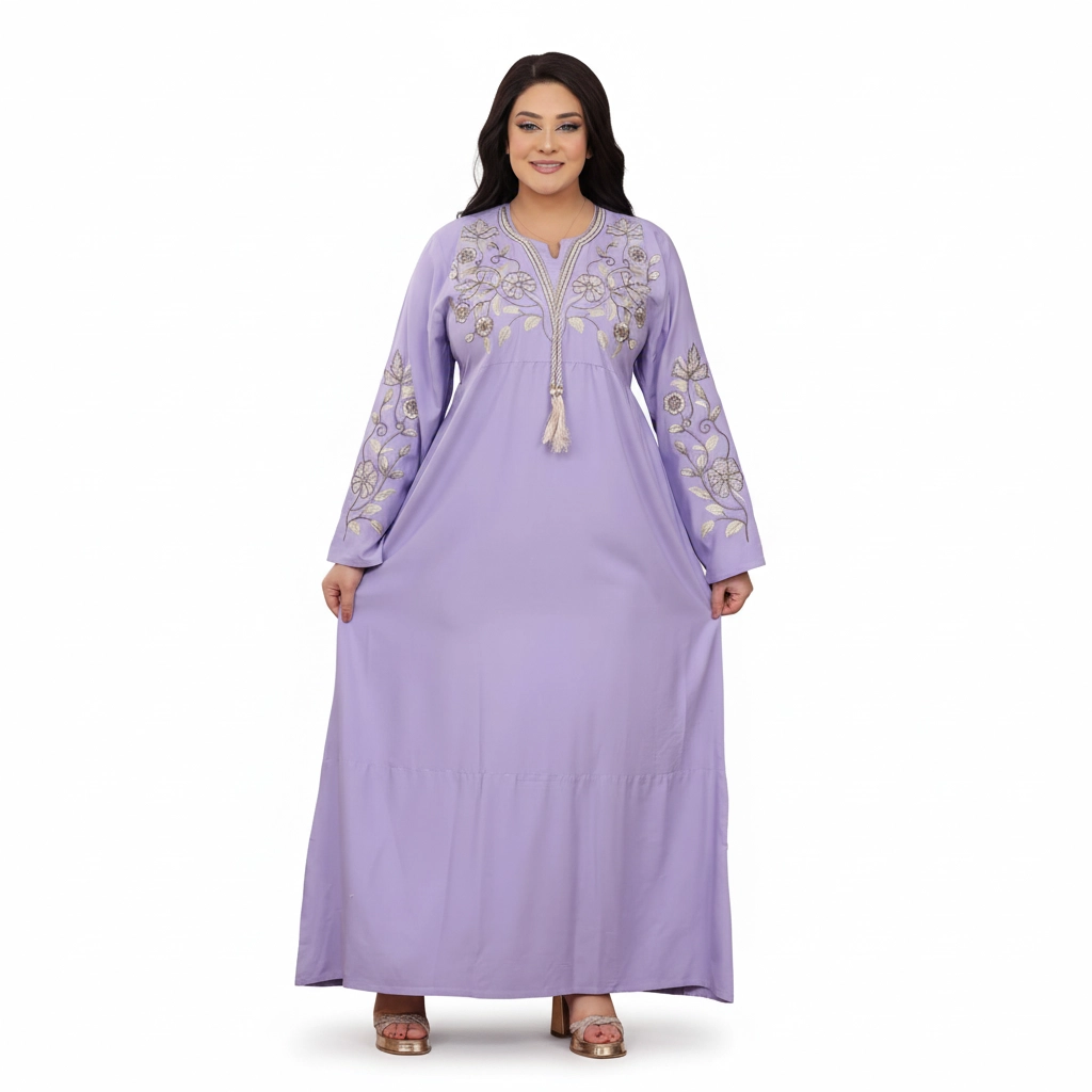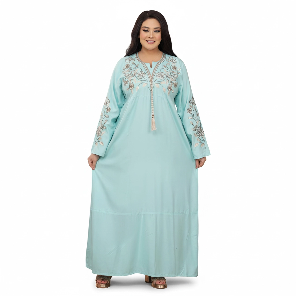 A decorative neckline tassel cord adds a charming traditional touch that enhances the overall aesthetic of the design. The flowing cut ensures graceful movement and a relaxed fit, making this abaya perfect for home receptions and casual gatherings.