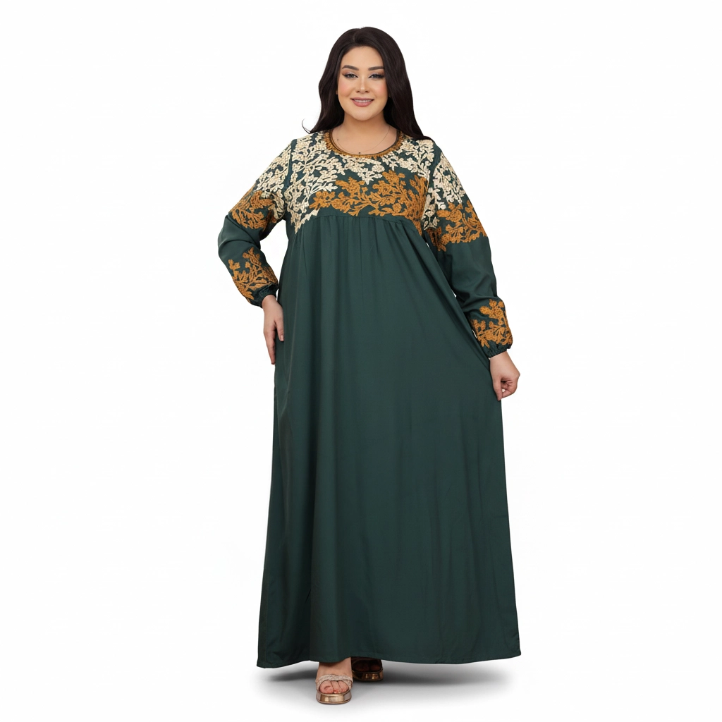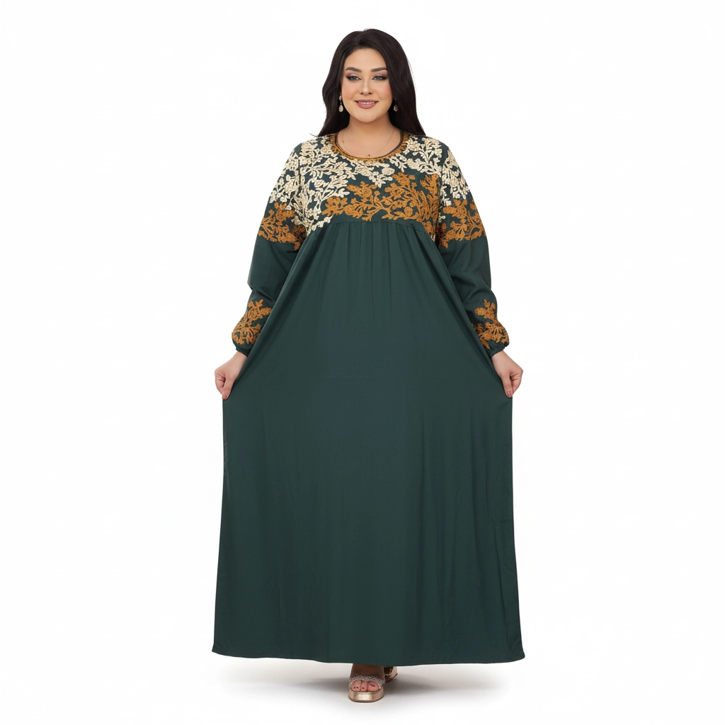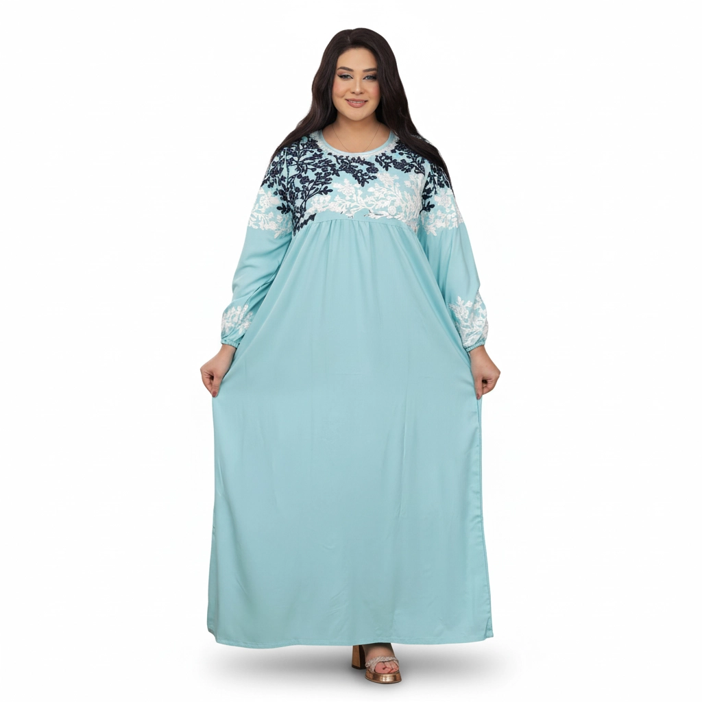 The relaxed gathered cut below the chest allows the fabric to flow gracefully, offering both comfort and a flattering drape for different body shapes. This makes the abaya perfect for daily elegant home wear, hosting guests, or relaxed social gatherings.