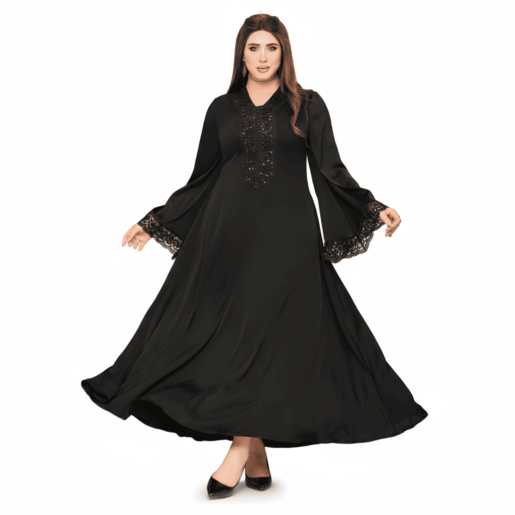 A sophisticated black flowing abaya designed for women who appreciate timeless elegance. This piece features a rich embroidered chest panel with subtle shine, complemented by lace-detailed wide sleeves that add a soft feminine touch.