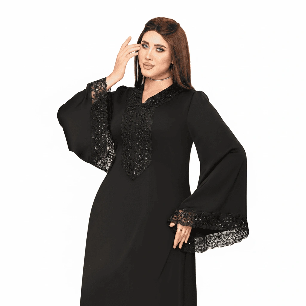 Sophisticated black flowing abaya with embroidered chest panel and lace-detailed wide sleeves.
