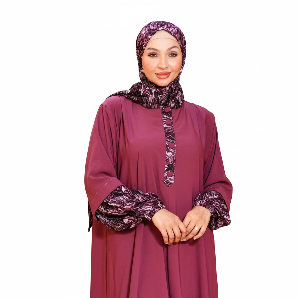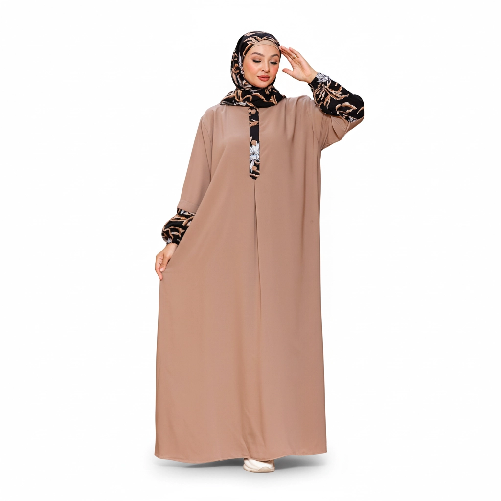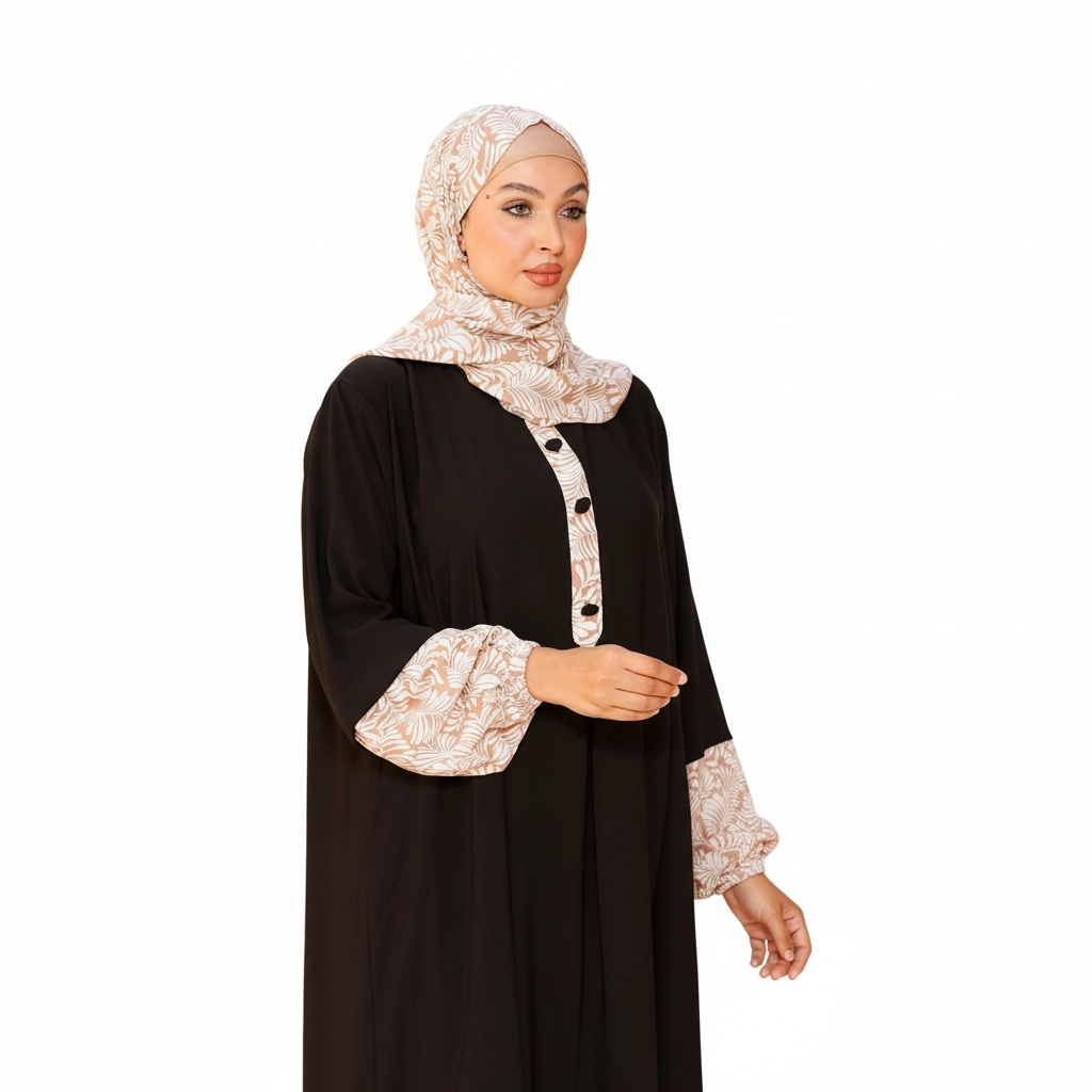 Introducing a stylish modest fashion piece designed to combine classic elegance with modern feminine details. This beautiful abaya stands out with its distinctive patterned accents on the sleeves, collar, and front placket, creating a refined visual contrast that elevates the entire design. The patterned fabric is carefully coordinated with the abaya color, giving the outfit a unique signature look that feels both fashionable and modest. The abaya features a flowing loose silhouette, offering comfort and graceful movement throughout the day. Decorative front buttons enhance the design while maintaining a clean, elegant structure. The matching hijab complements the patterned elements, completing a sophisticated modest outfit suitable for many occasions. For online stores, boutiques, and resellers, this model performs well due to its distinctive design details and elegant color combinations, making it highly attractive for modest fashion collections.