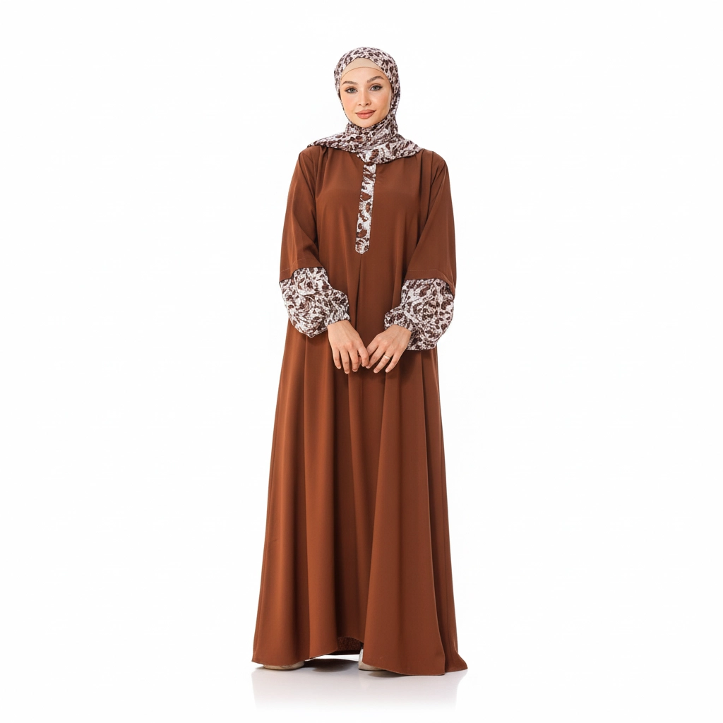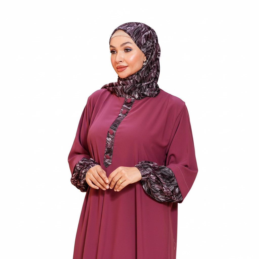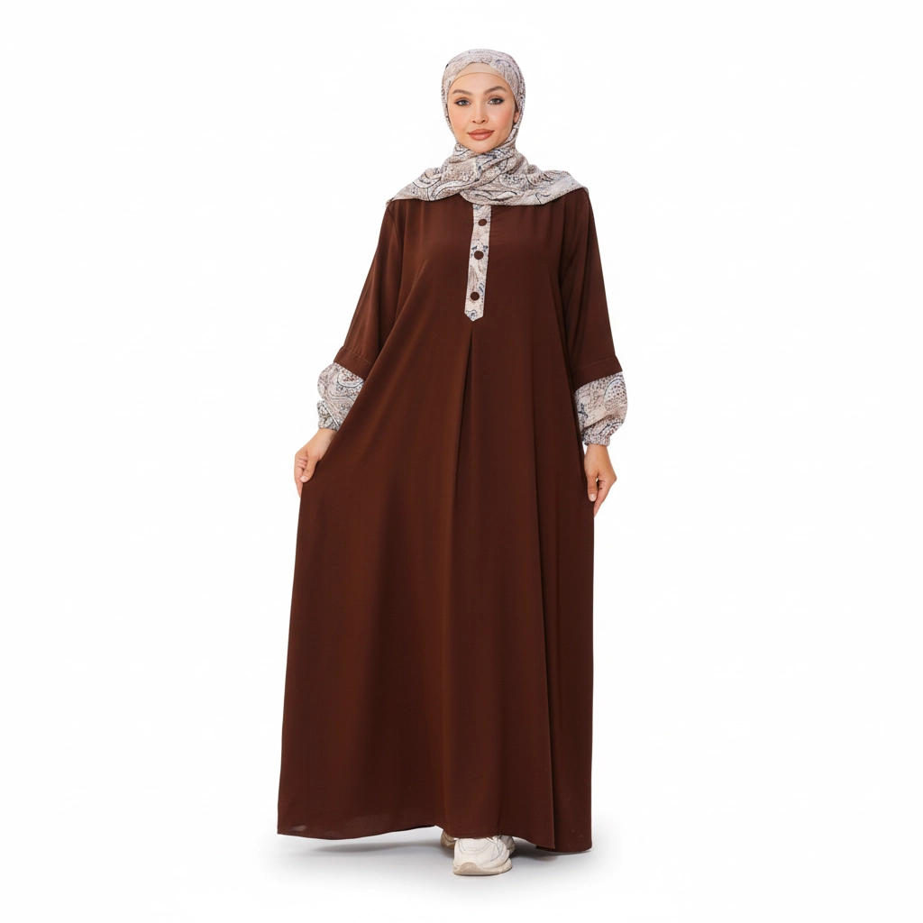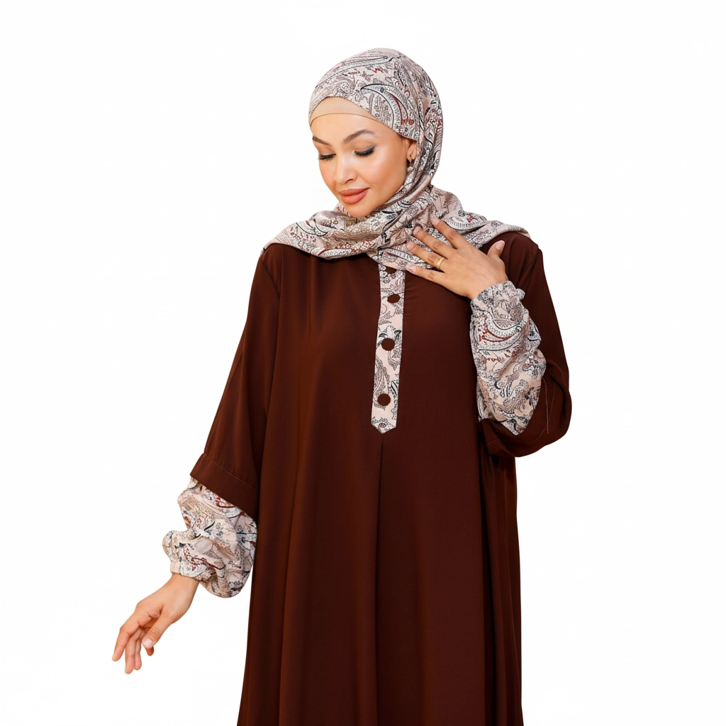 Introducing a stylish modest fashion piece designed to combine classic elegance with modern feminine details. This beautiful abaya stands out with its distinctive patterned accents on the sleeves, collar, and front placket, creating a refined visual contrast that elevates the entire design. The patterned fabric is carefully coordinated with the abaya color, giving the outfit a unique signature look that feels both fashionable and modest. The abaya features a flowing loose silhouette, offering comfort and graceful movement throughout the day. Decorative front buttons enhance the design while maintaining a clean, elegant structure. The matching hijab complements the patterned elements, completing a sophisticated modest outfit suitable for many occasions. For online stores, boutiques, and resellers, this model performs well due to its distinctive design details and elegant color combinations, making it highly attractive for modest fashion collections.