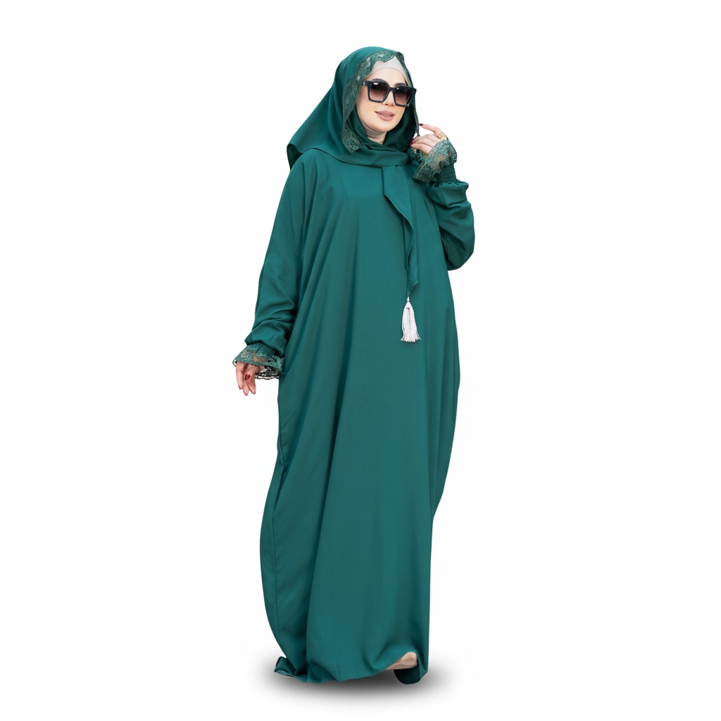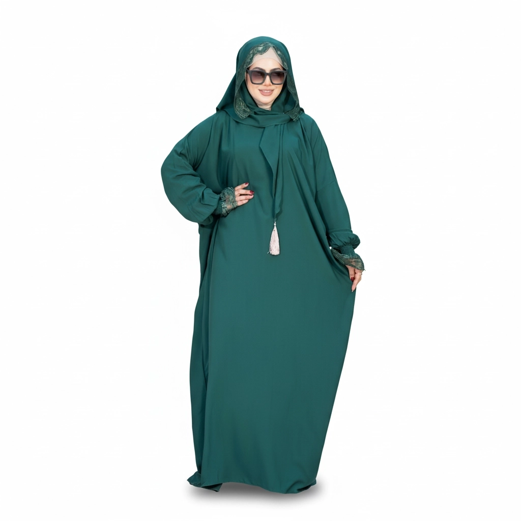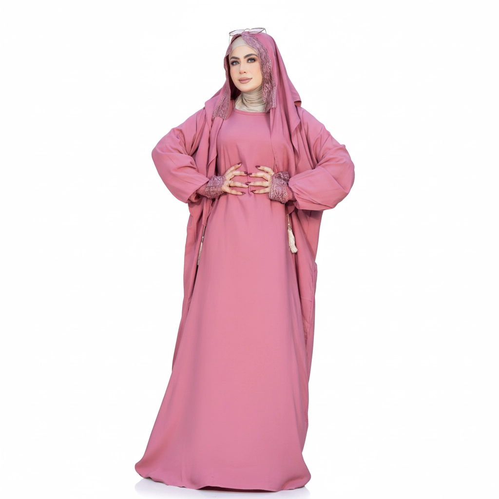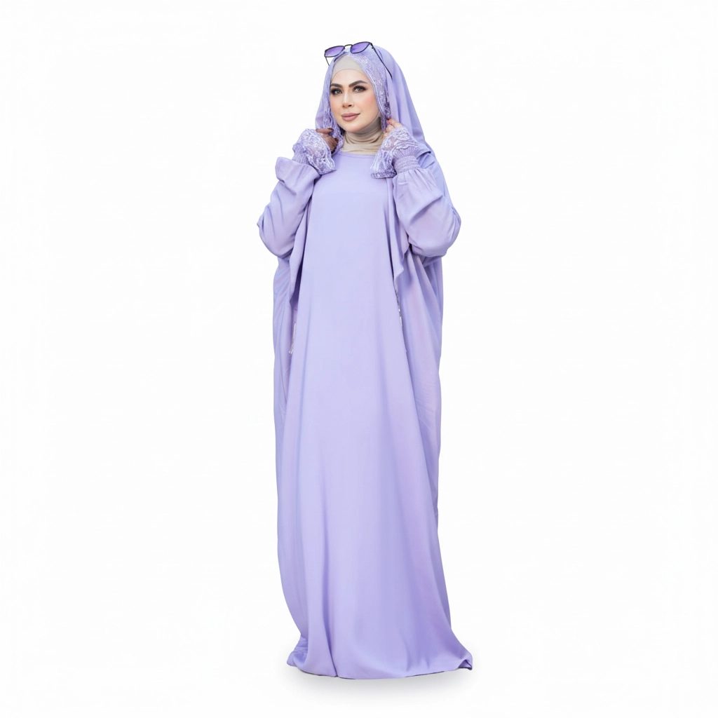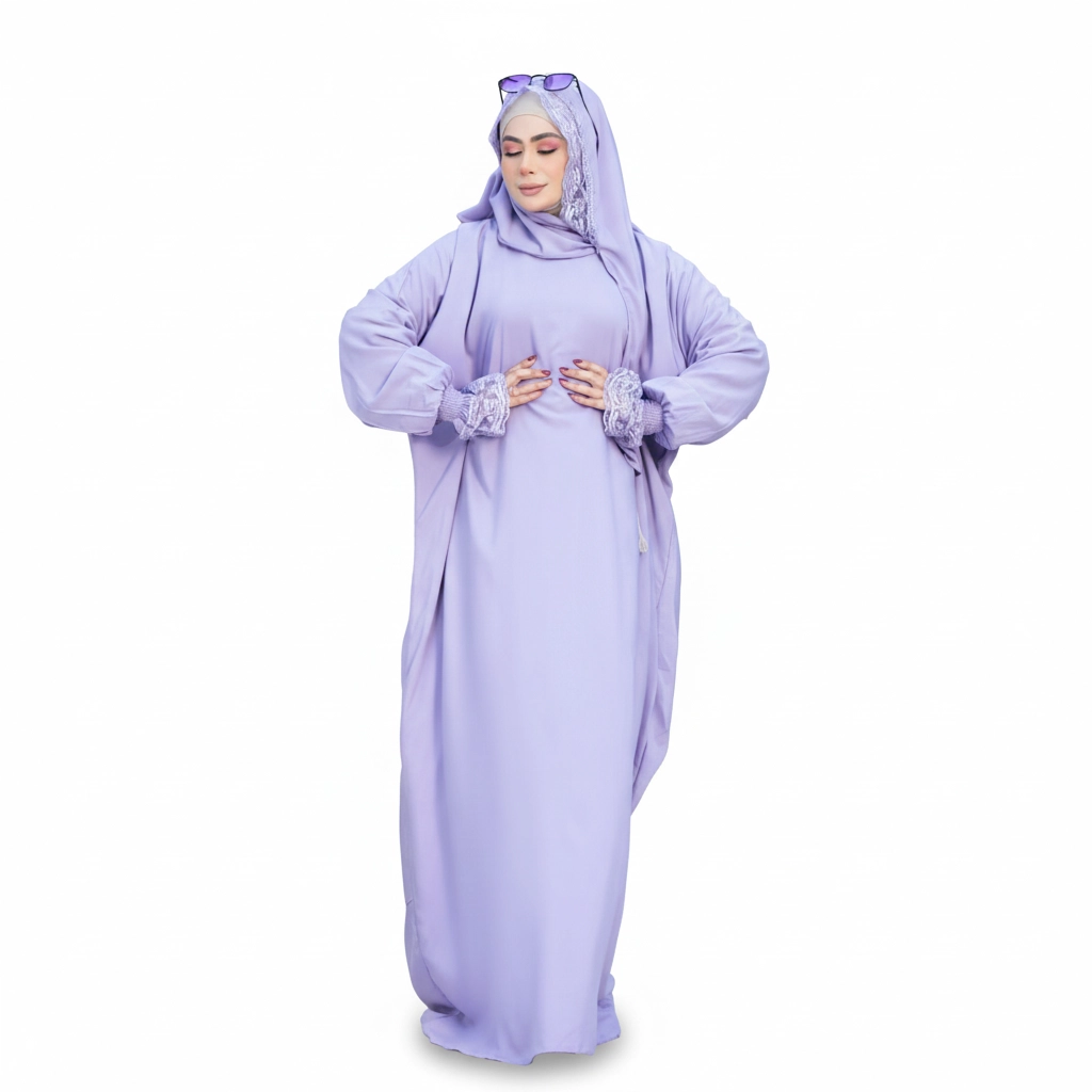 A comfortable and elegant two-piece prayer isdal set with delicate lace trim on the khimar and sleeve cuffs. Available in five beautiful colors.