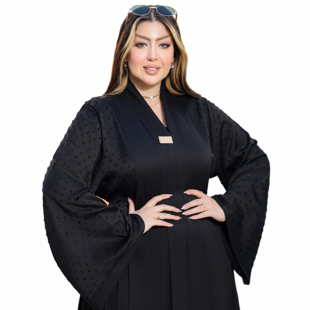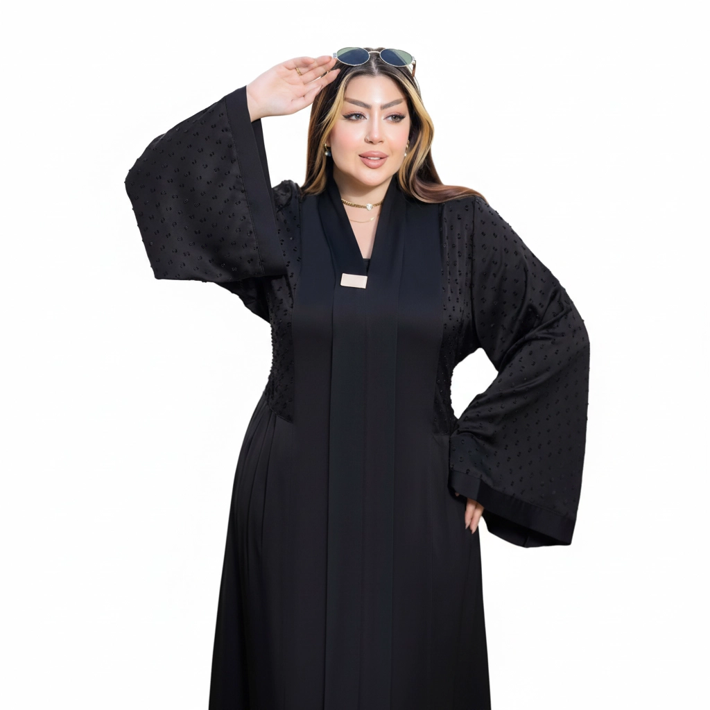 A minimalist luxury abaya featuring textured sleeves and a clean silhouette, crafted from premium silk for a refined and timeless modest fashion look.