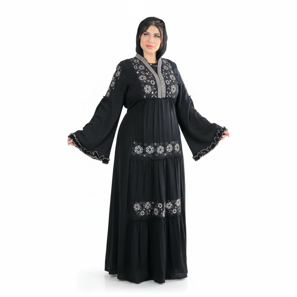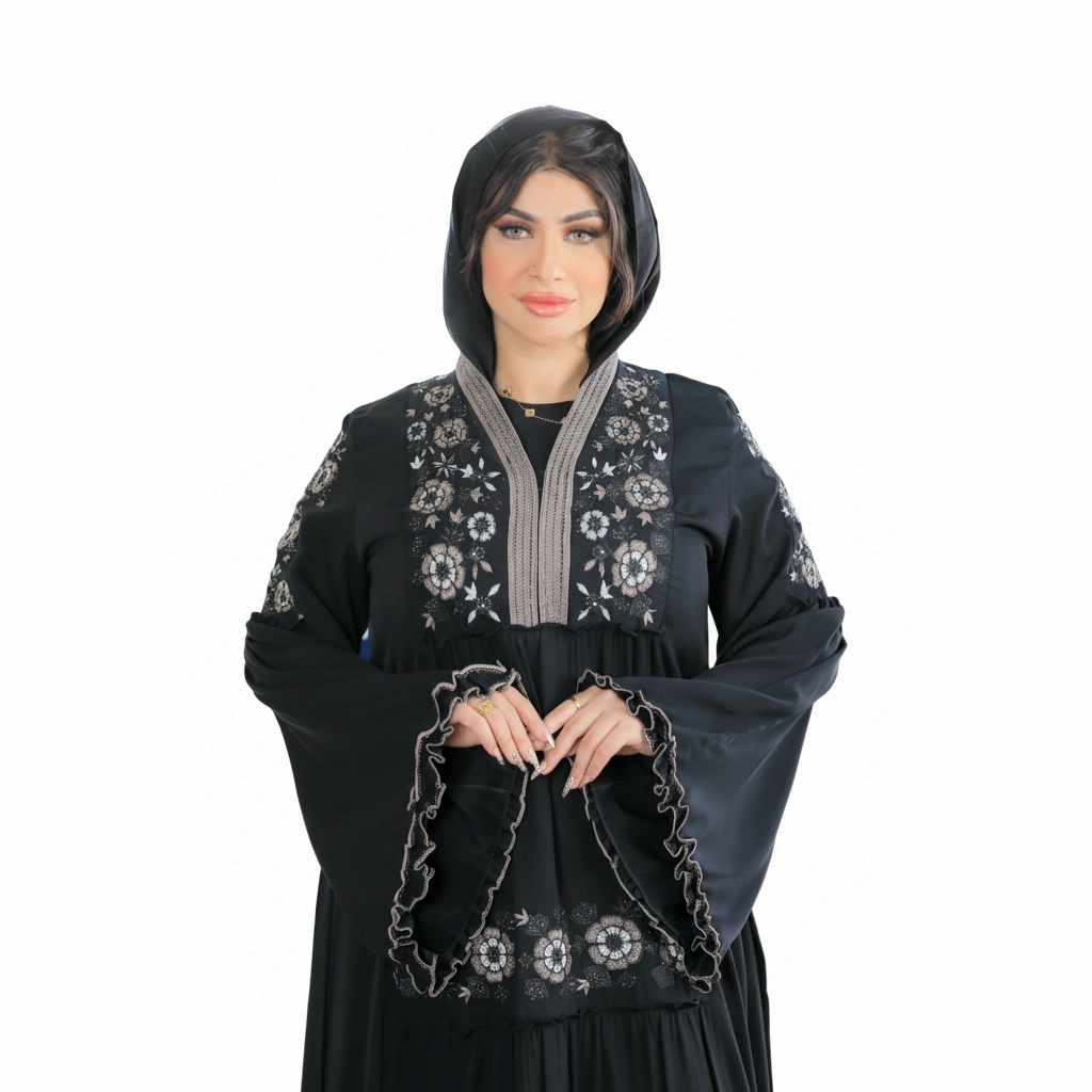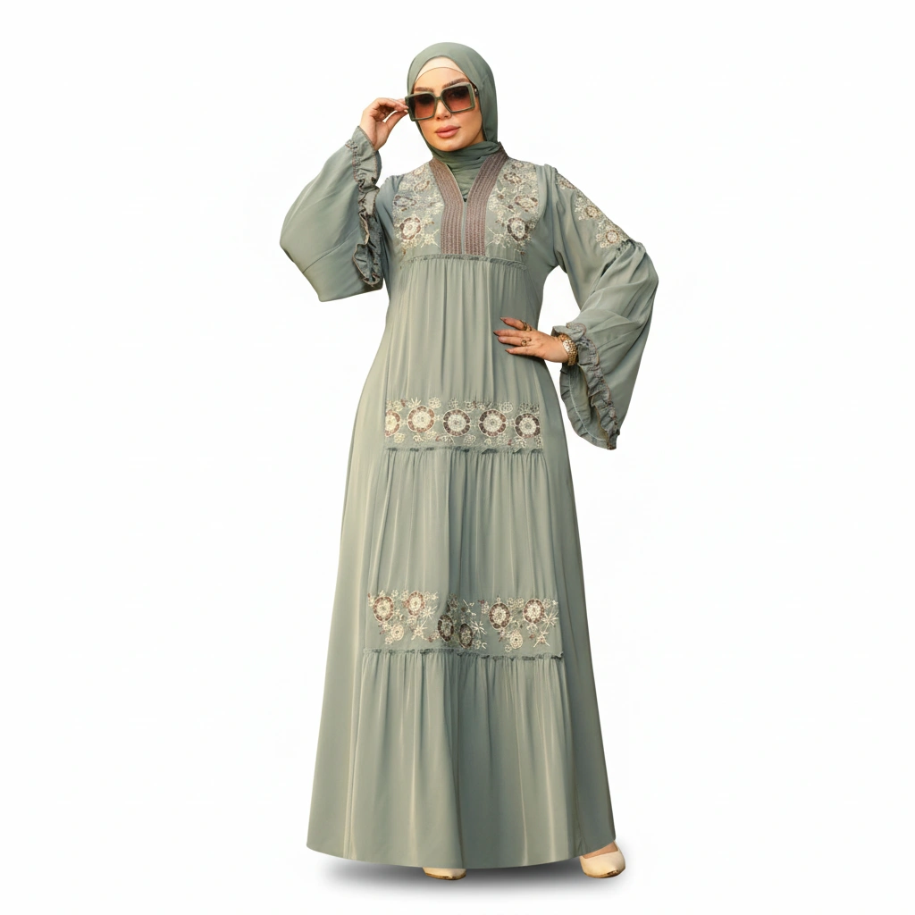 A refined premium silk abaya designed for elegant modest fashion, featuring luxurious details and a graceful silhouette.
