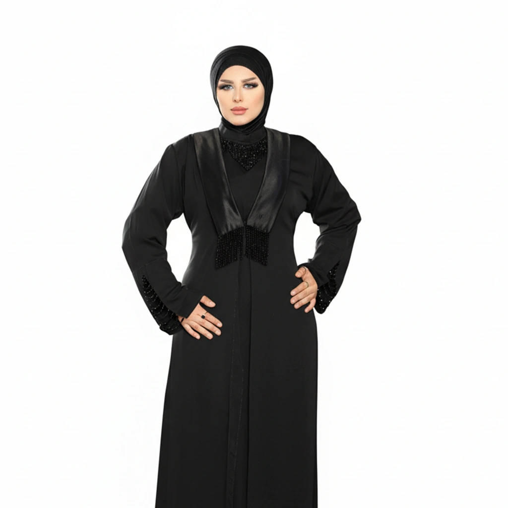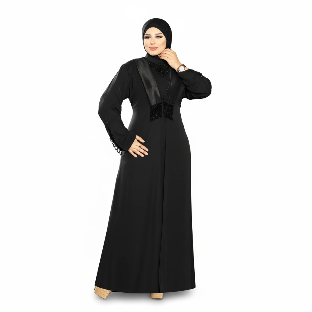 A refined luxury abaya designed with elegant crystal embellishments that add subtle shine and sophistication. The structured silhouette is enhanced with modern panel detailing, creating a graceful and flattering look suitable for evening wear and formal occasions.