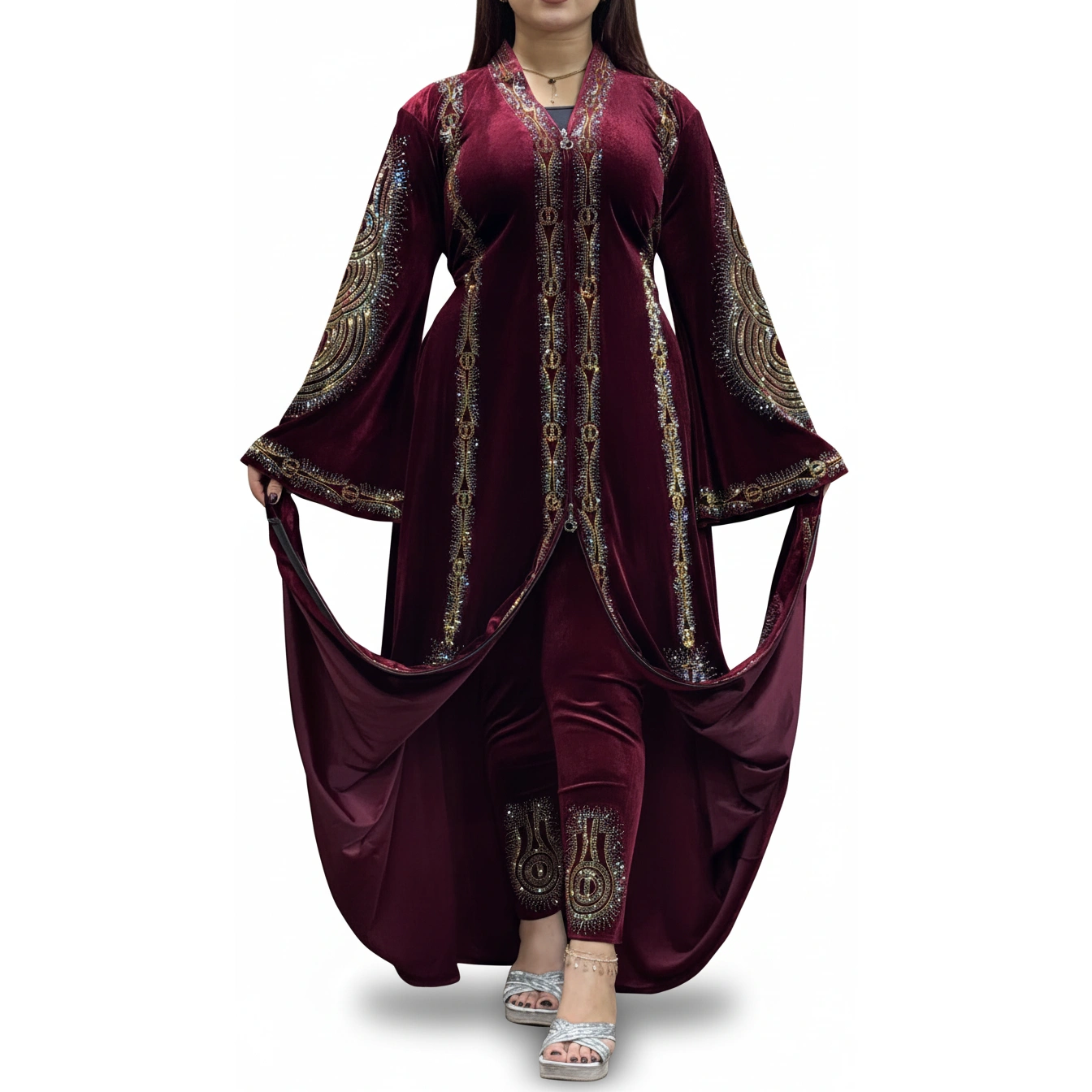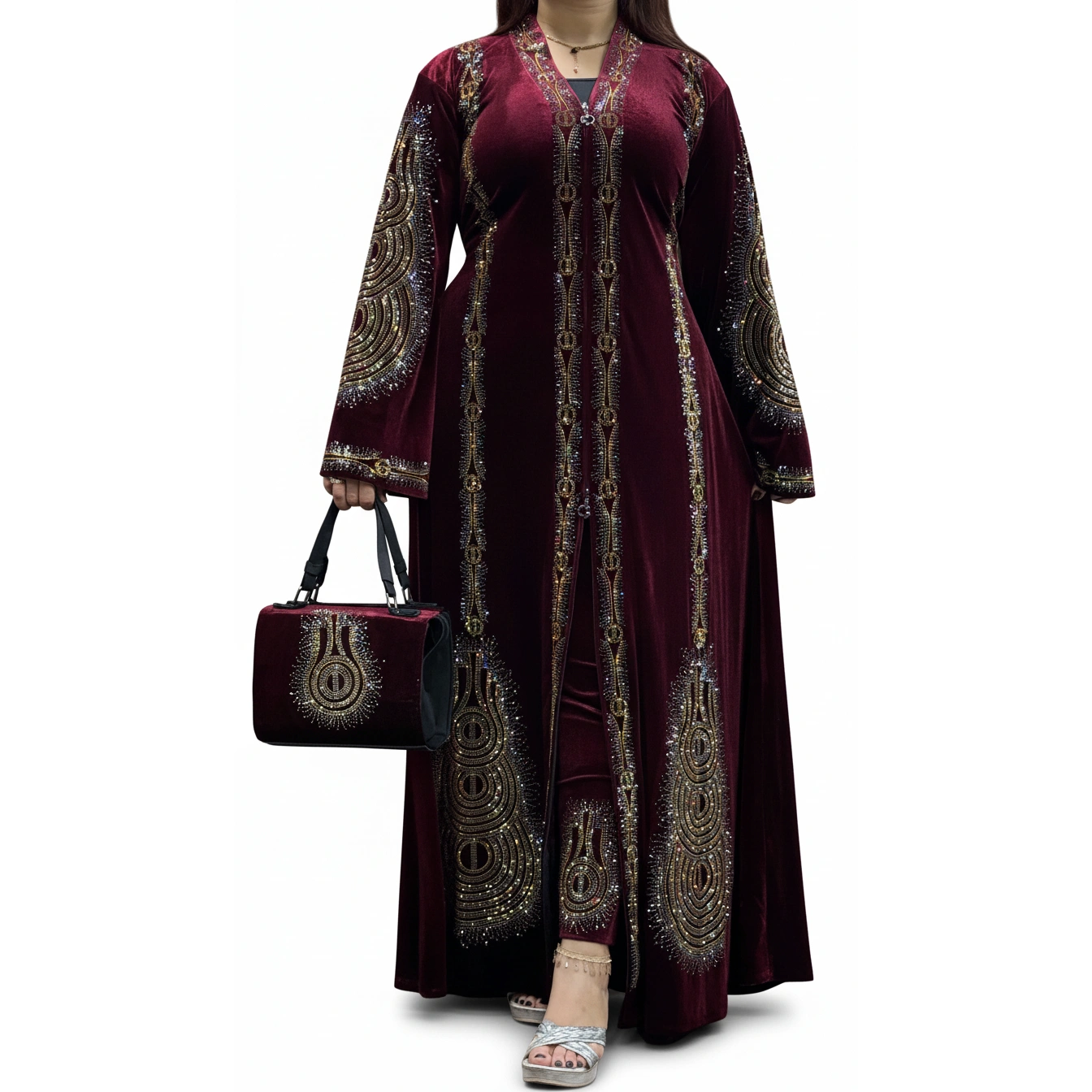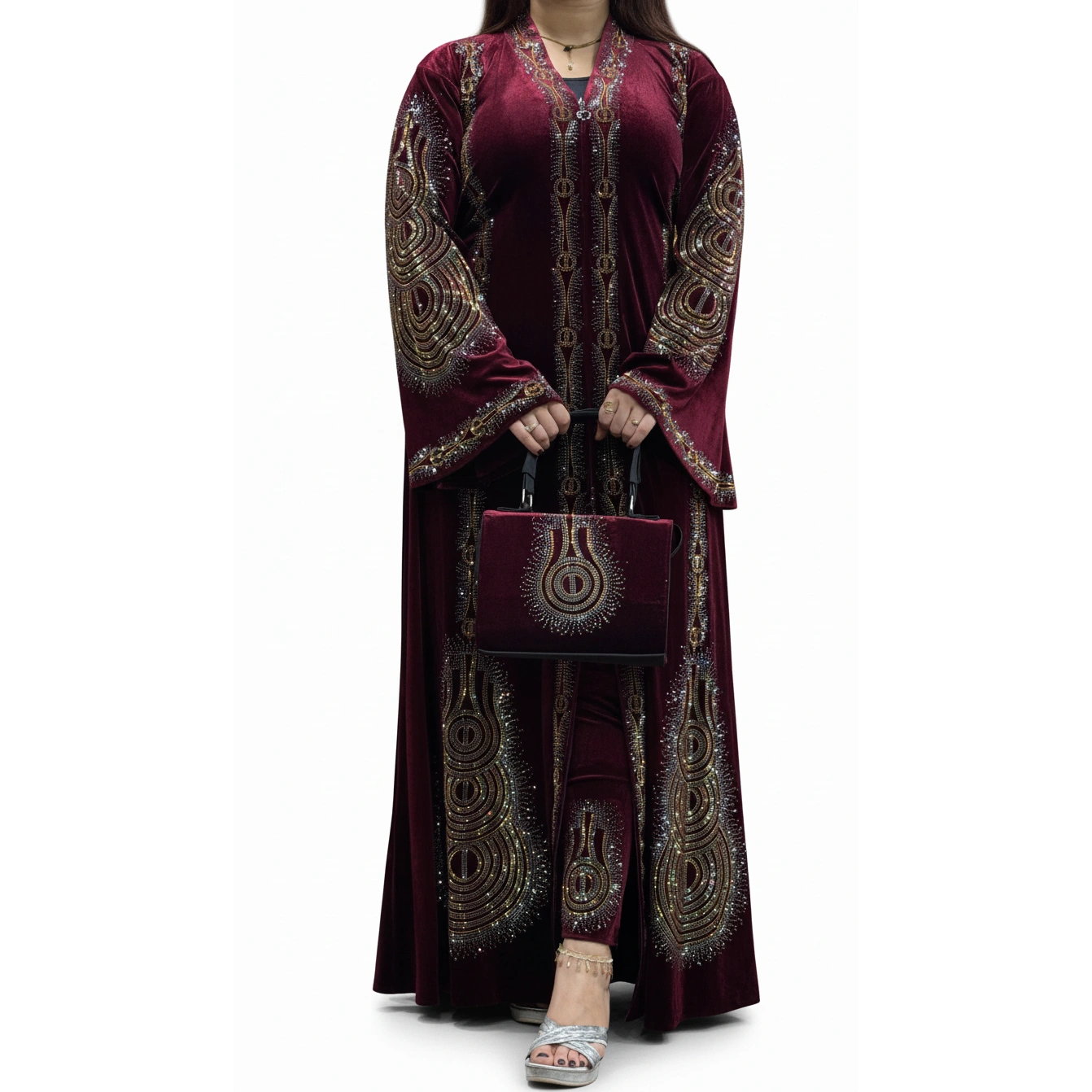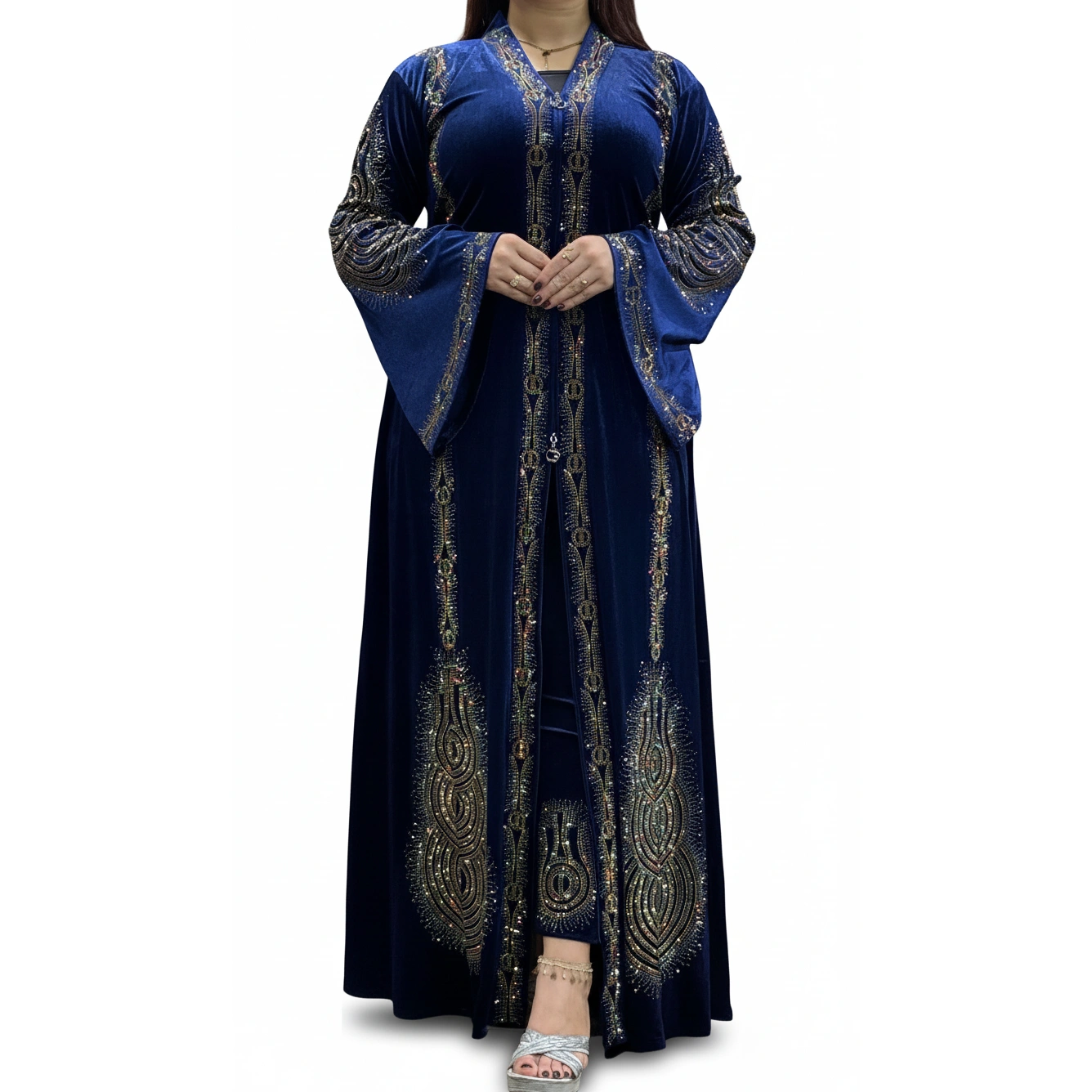 A luxurious 3-piece French velvet abaya set adorned with stunning Italian crystal embroidery. Available in Black, Blue, Burgundy, and Green.