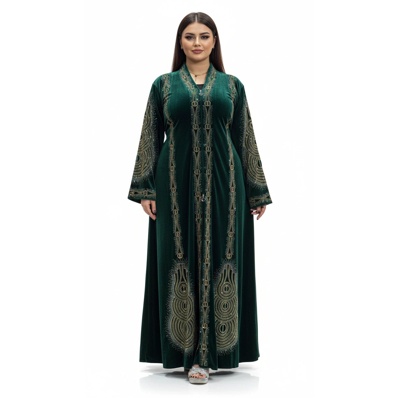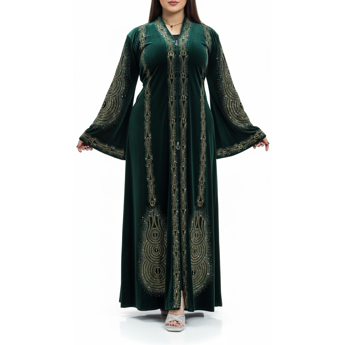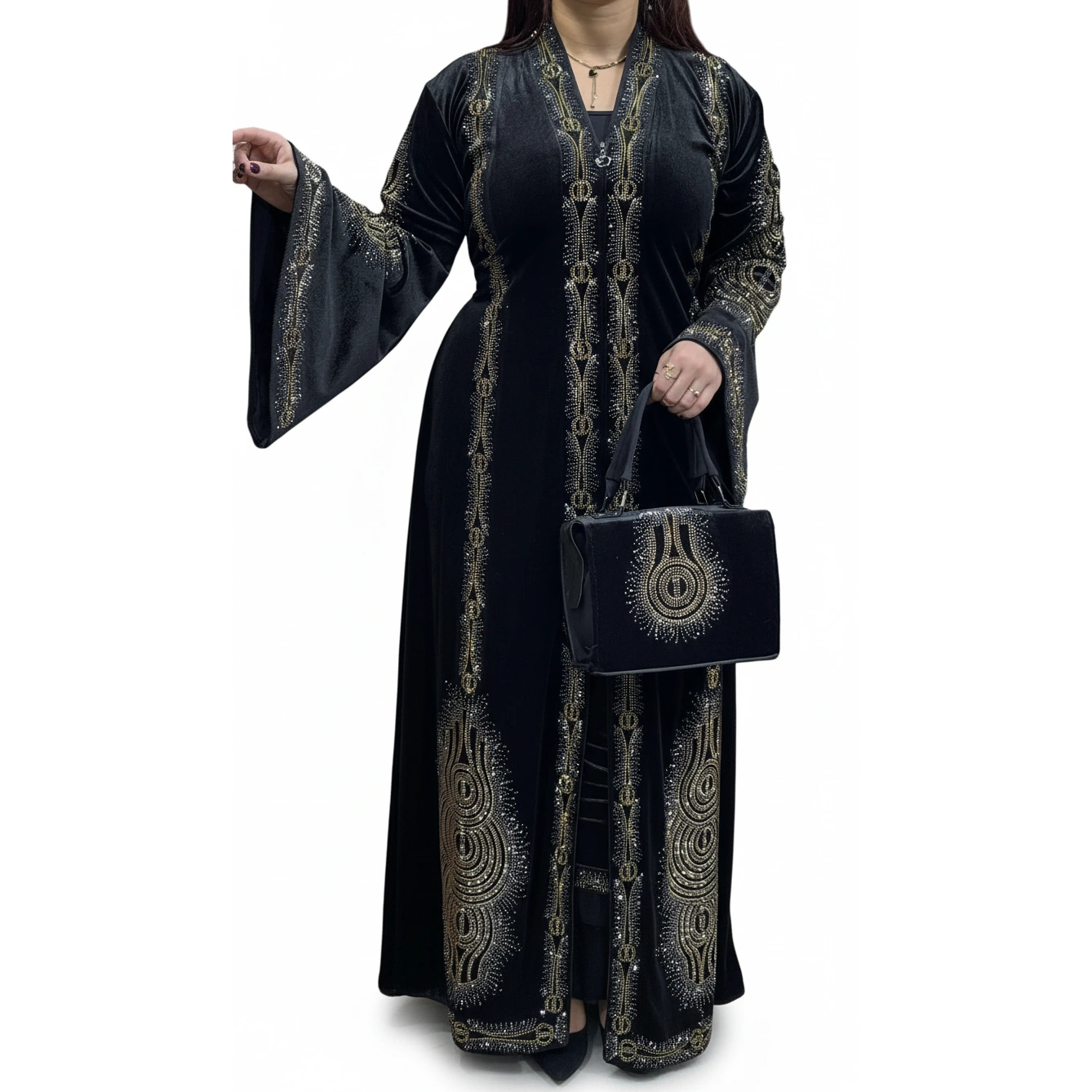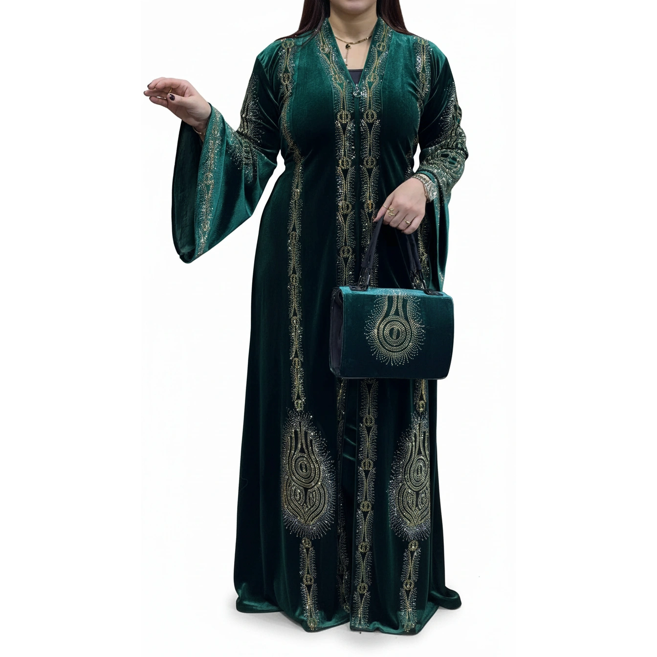 A luxurious 3-piece French velvet abaya set adorned with stunning Italian crystal embroidery. Available in Black, Blue, Burgundy, and Green.