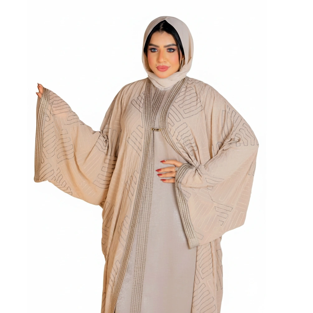 A refined Gulf-style two-piece abaya crafted from lightweight chiffon fabric and adorned with exquisite embroidery, combining modesty with effortless elegance.