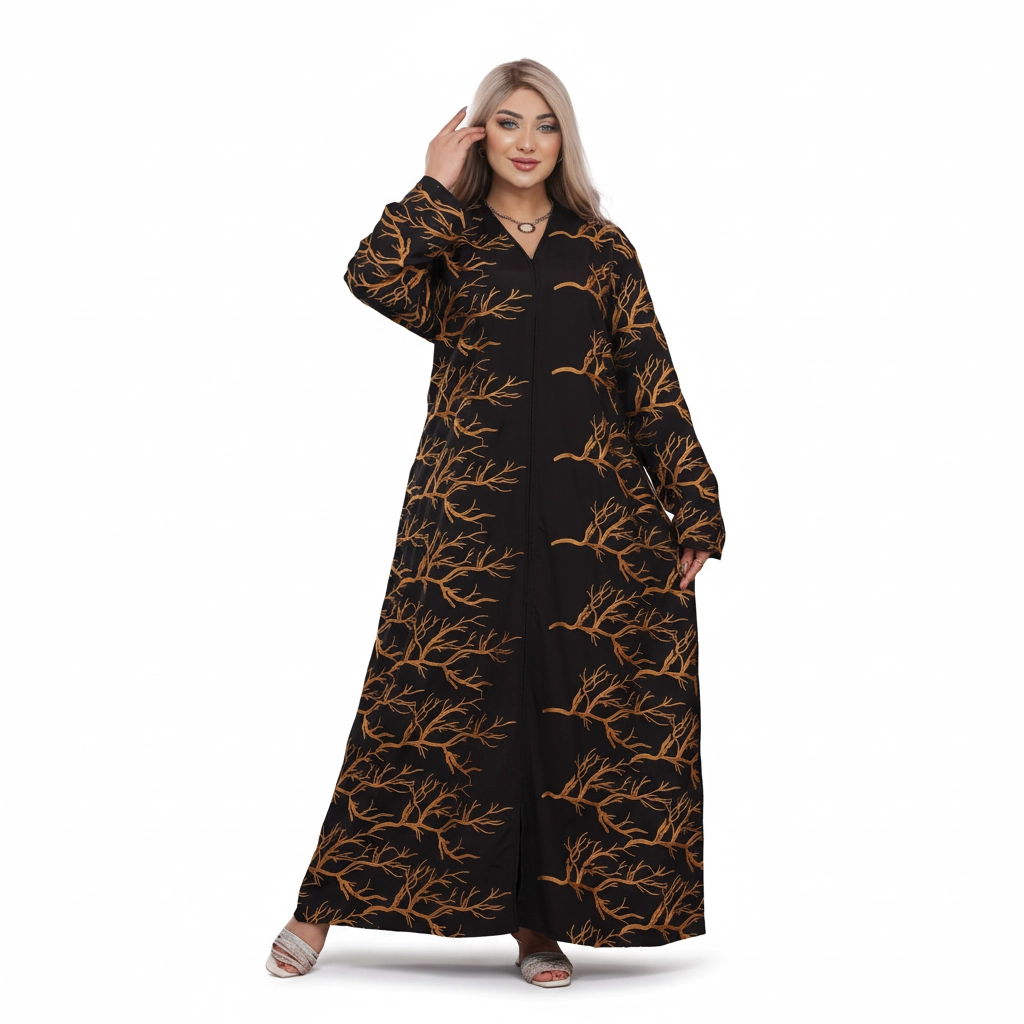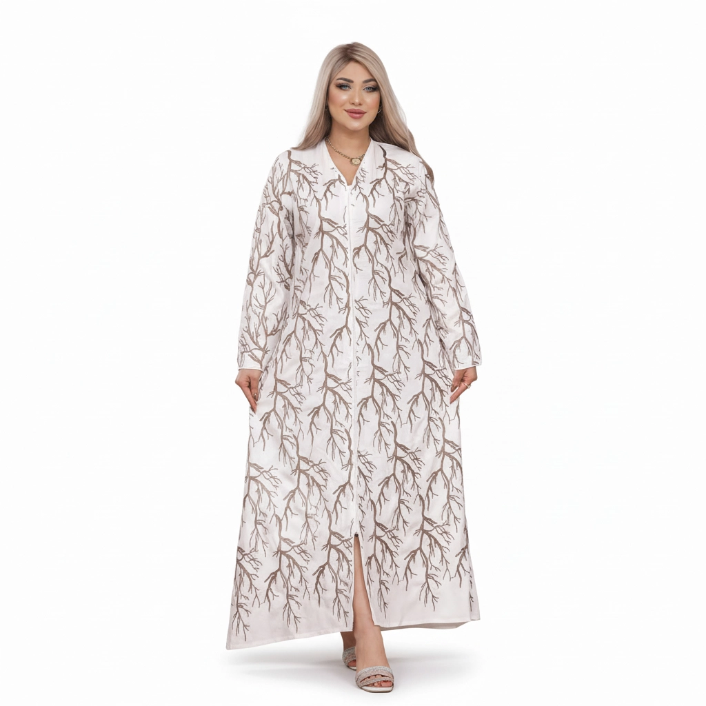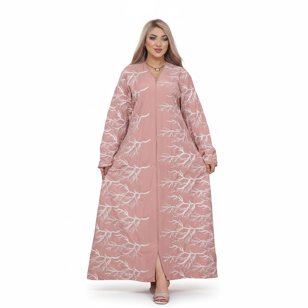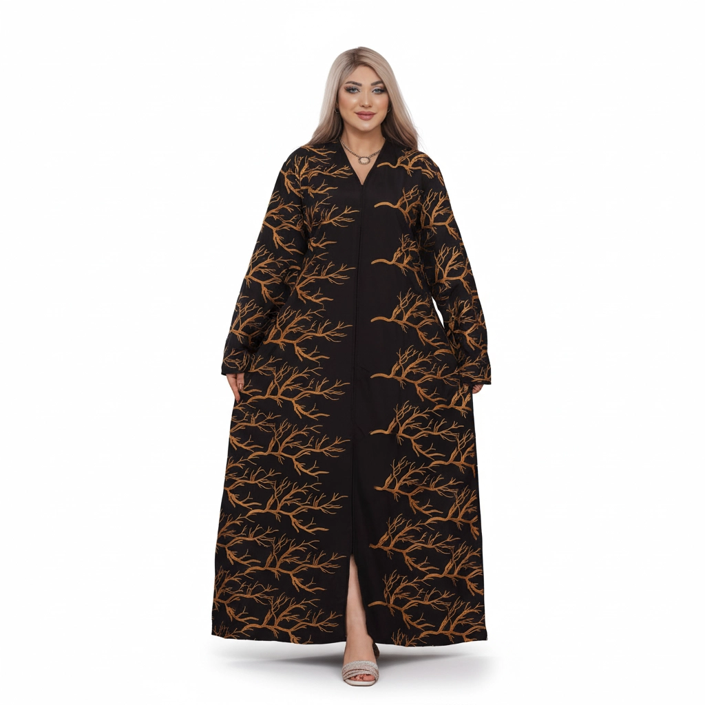 This abaya features a unique branch-inspired print pattern flowing elegantly across the entire fabric, creating a soft, organic visual texture that adds depth and sophistication to the design. The delicate botanical motif gives the abaya a contemporary artistic look while maintaining the timeless modest silhouette that defines classic abaya fashion.