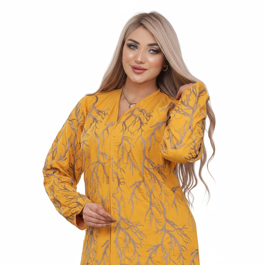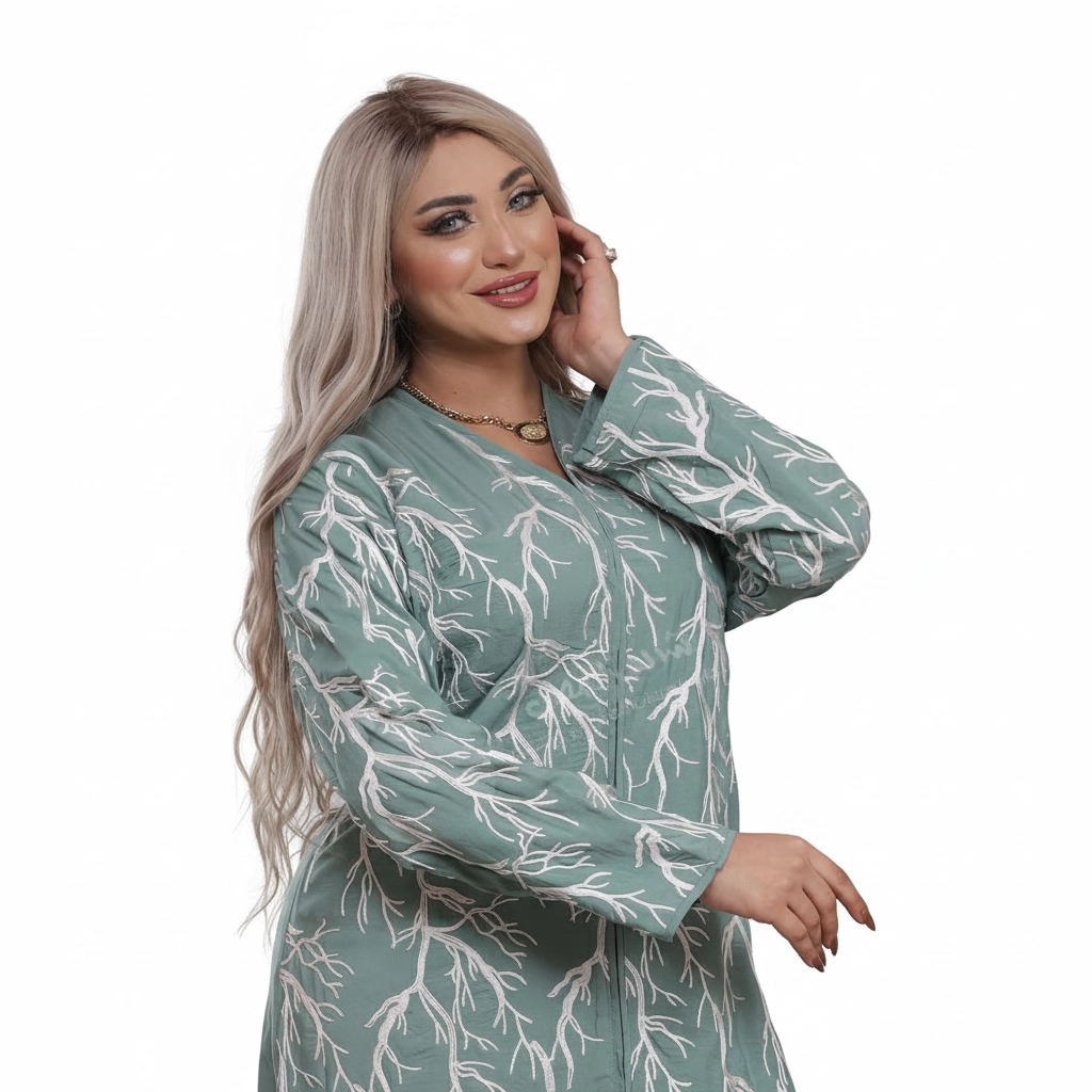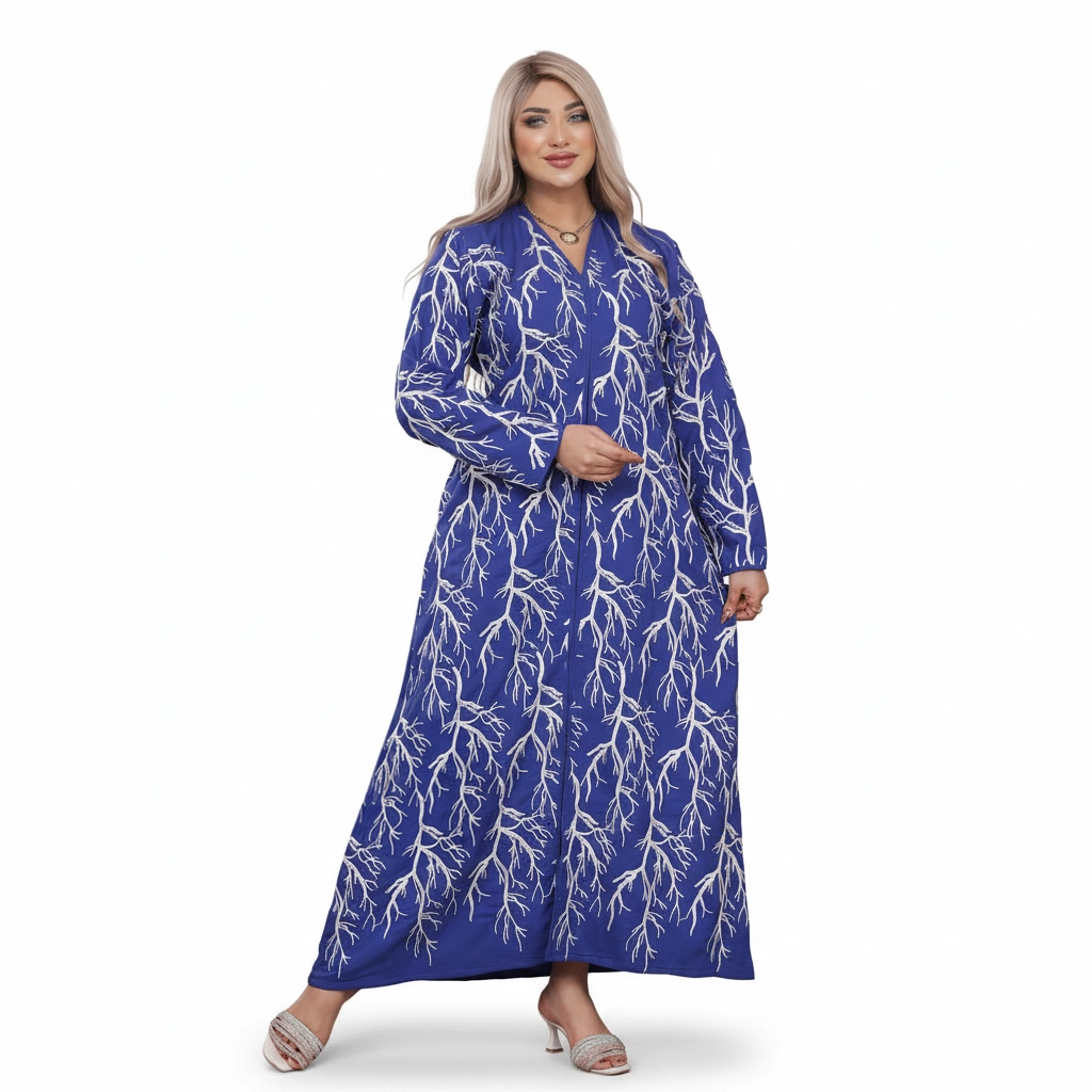 Designed with a clean front closure and a relaxed straight cut, the abaya offers both comfort and elegance, making it ideal for everyday luxury wear at home or while welcoming guests. The minimalist neckline and long sleeves complement the all-over pattern beautifully, allowing the fabric design to remain the highlight of the piece.