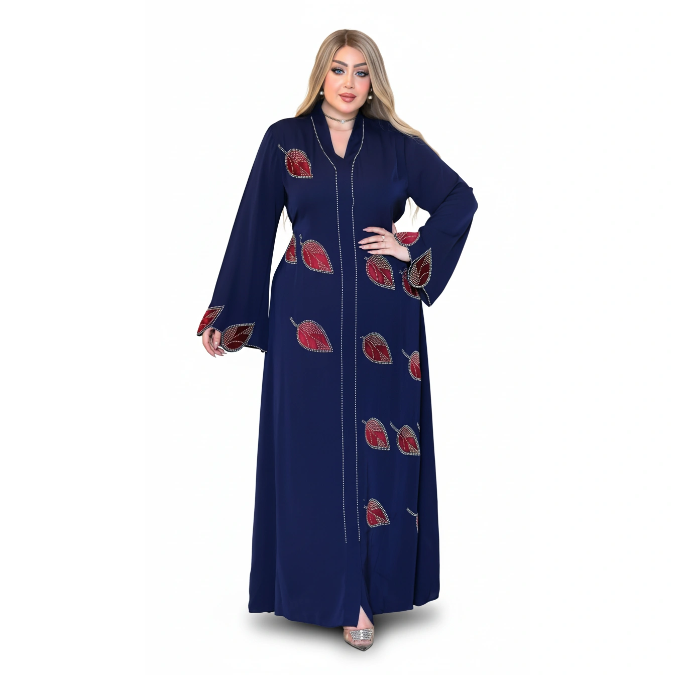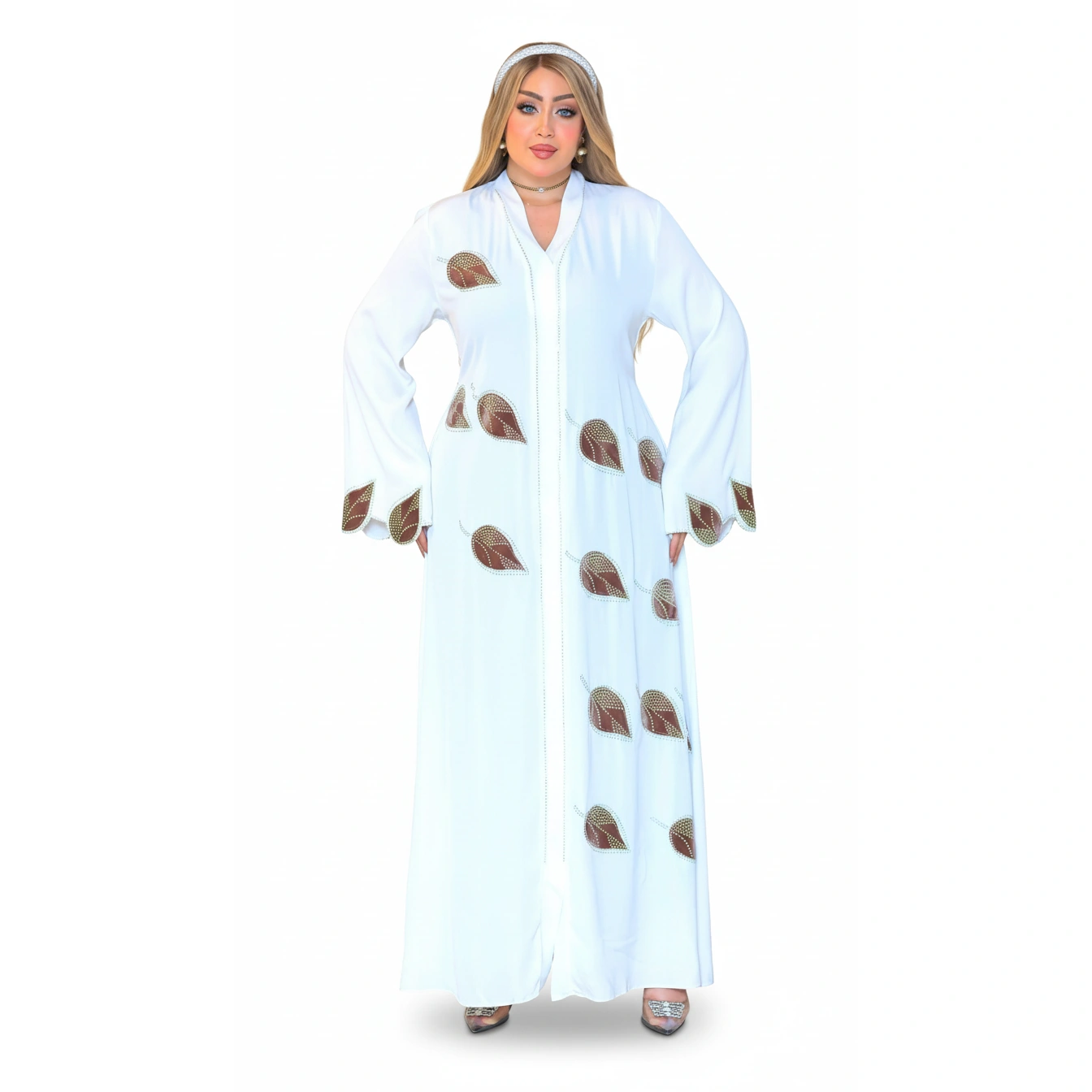 Luxury Silk Abaya with Crystal Leaf Embroidery – Elegant Modest Fashion in premium silk. Available in Yellow, White, Navy. Sizes L-XXXL.