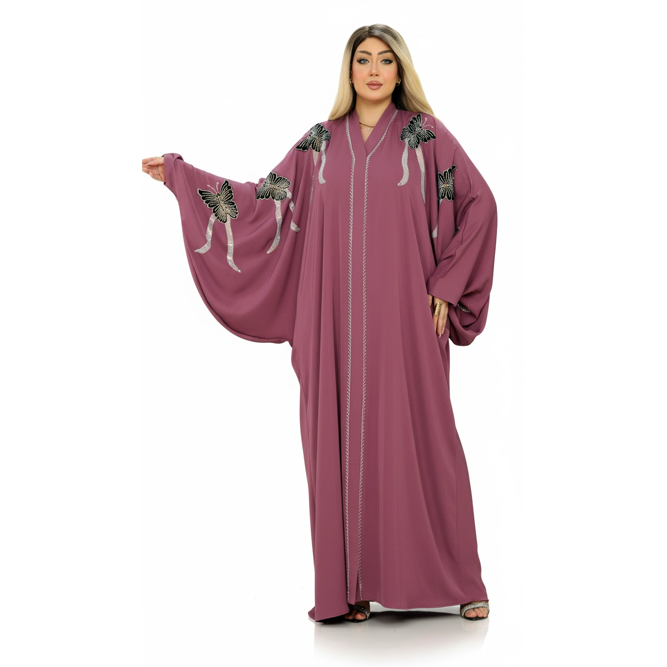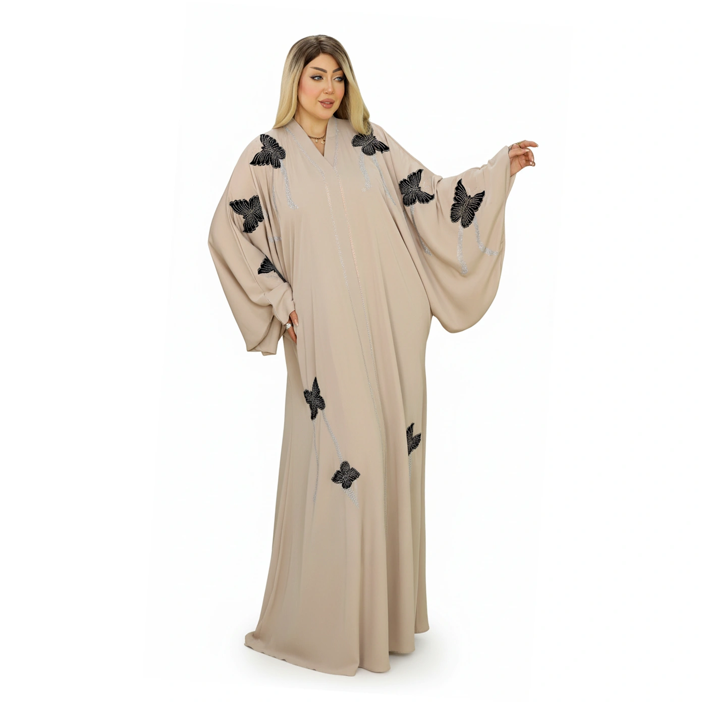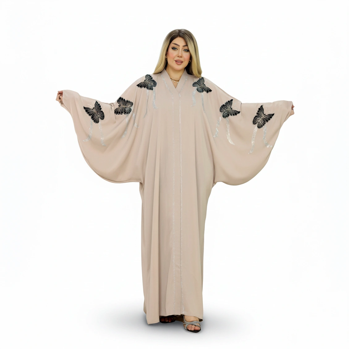 Luxury Silk Butterfly Embroidered Abaya – Elegant Wide Sleeve Design in premium silk. Available in Dusty Rose, Beige, Teal, Navy. Sizes L-XXXL.