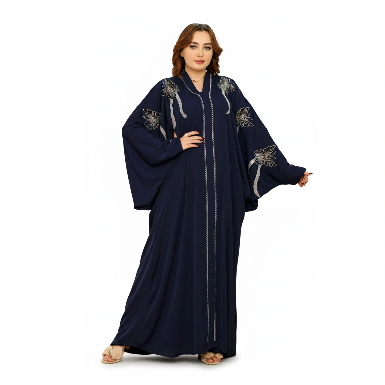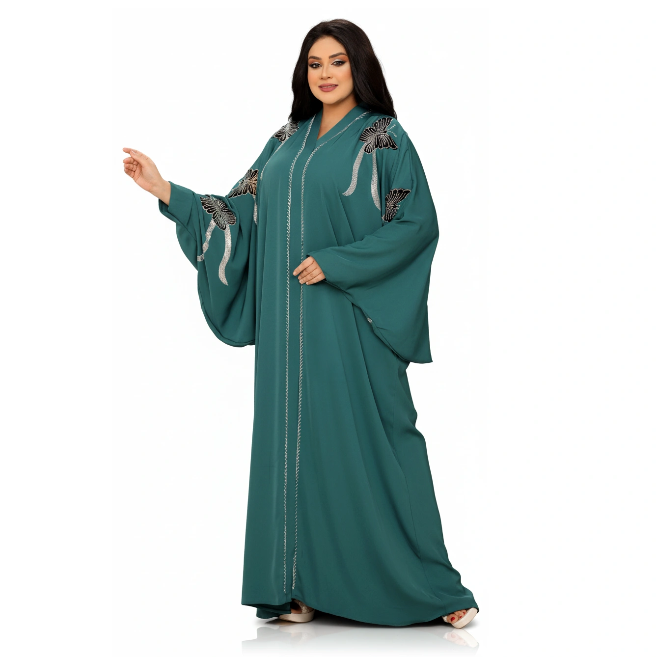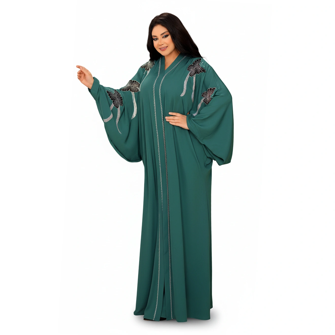 Luxury Silk Butterfly Embroidered Abaya – Elegant Wide Sleeve Design in premium silk. Available in Dusty Rose, Beige, Teal, Navy. Sizes L-XXXL.