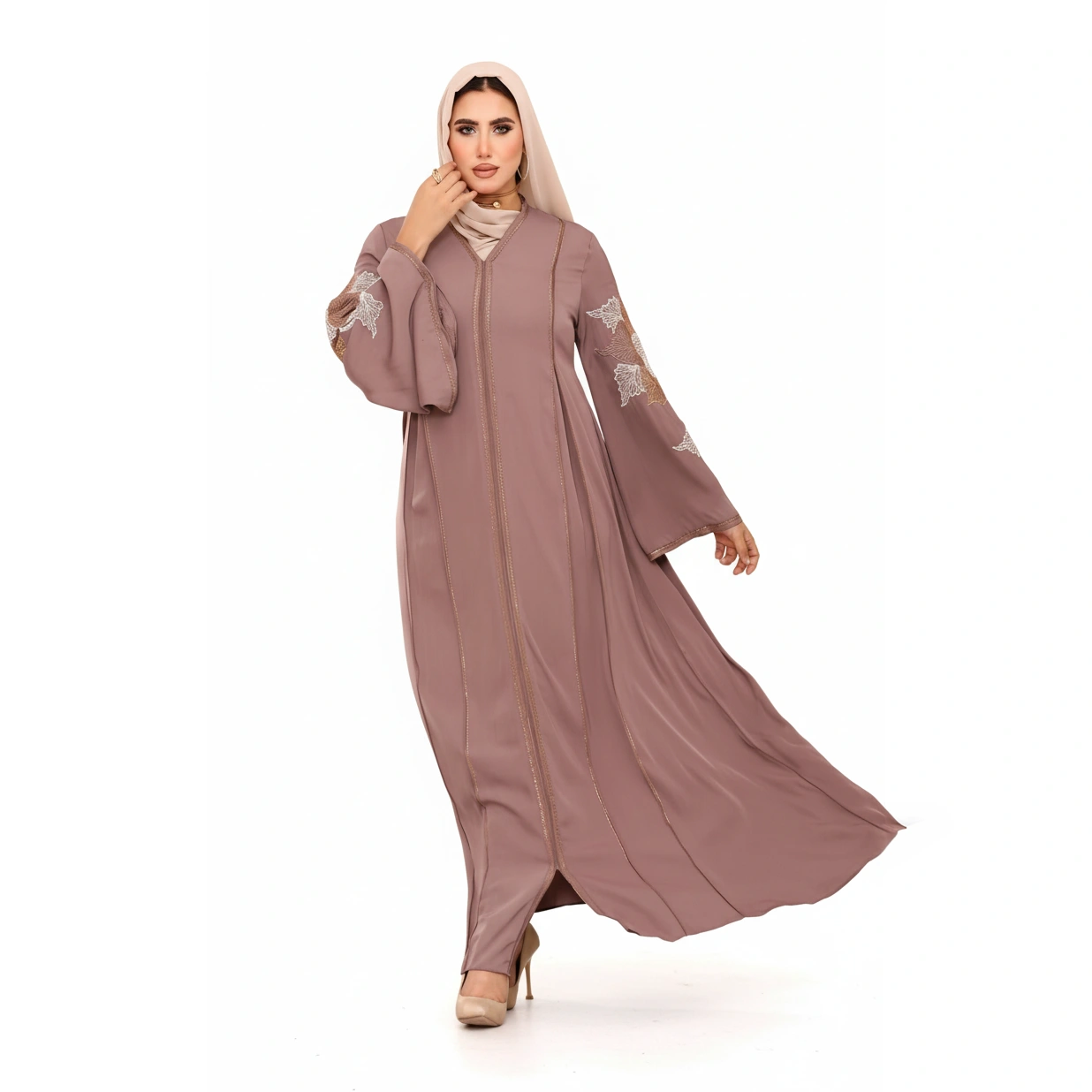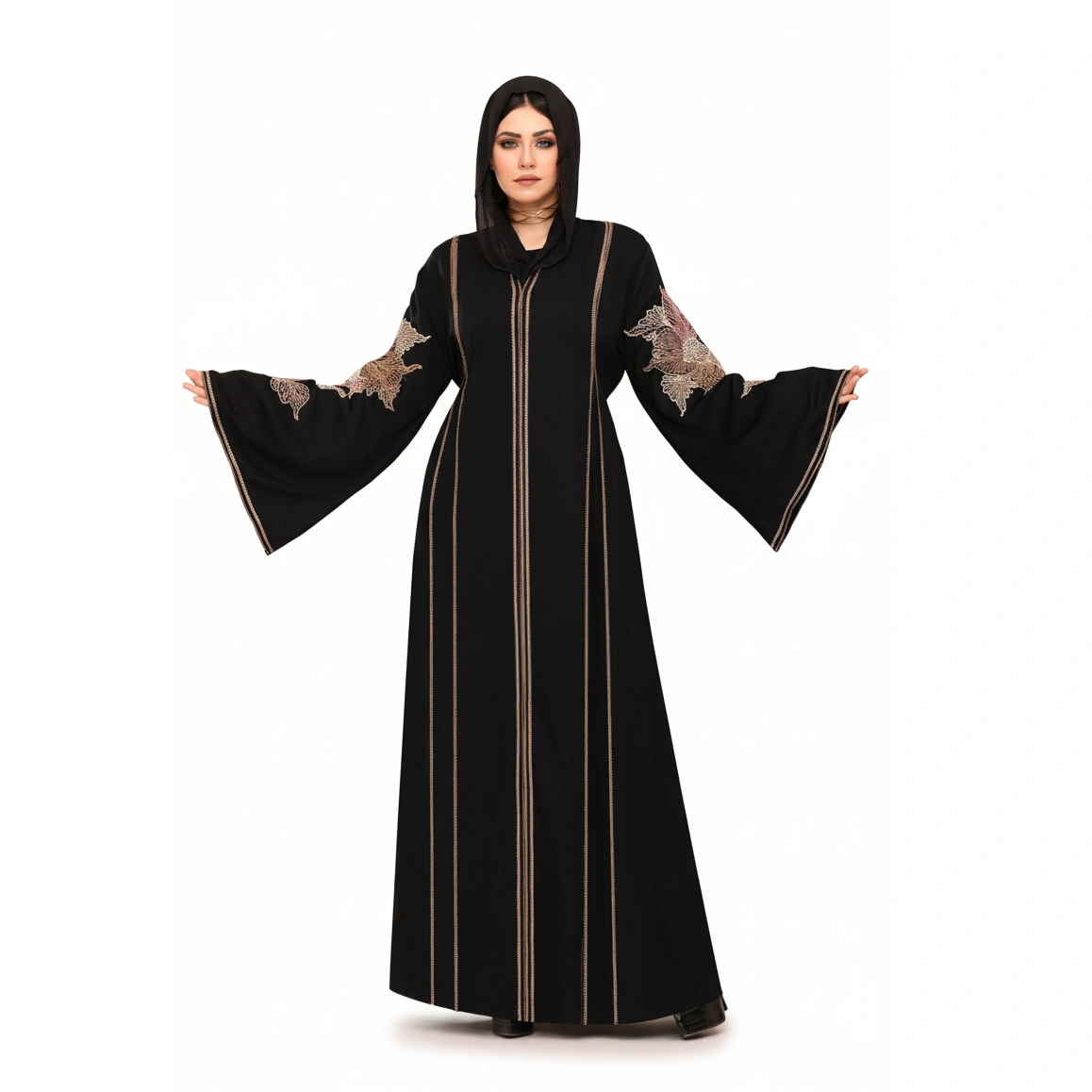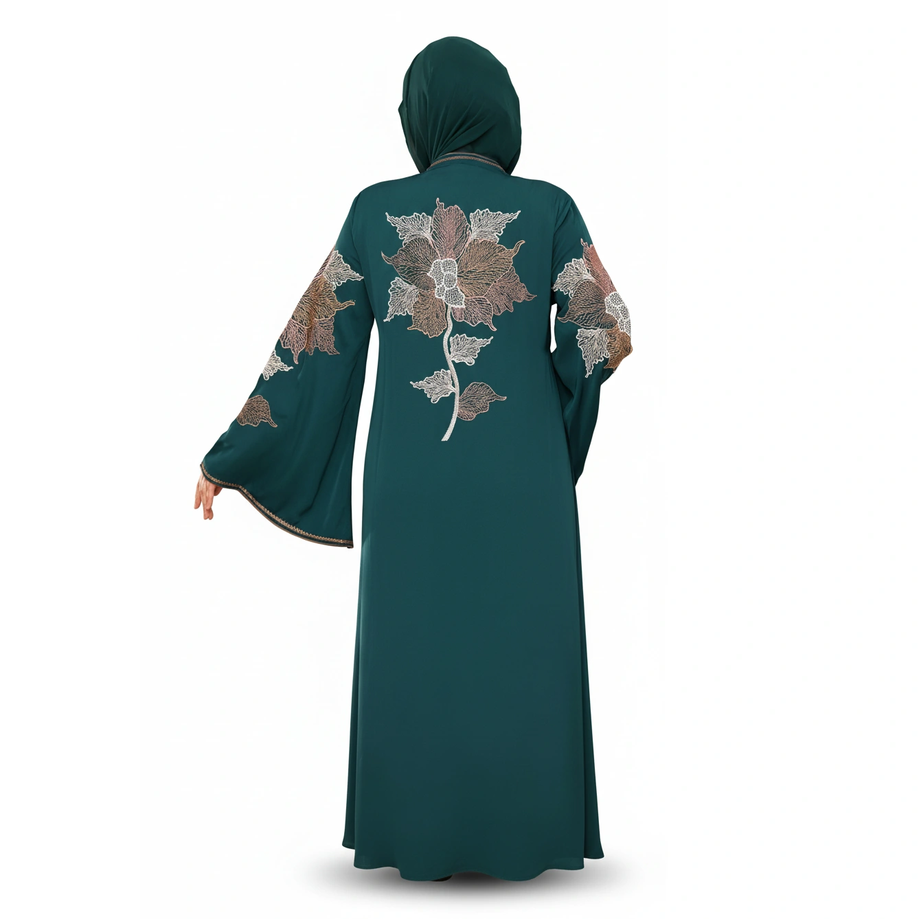 A luxurious silk embroidered abaya featuring elegant wide sleeves. Available in Navy, Emerald, Cashmere, and Black.