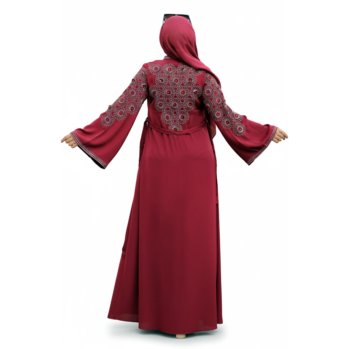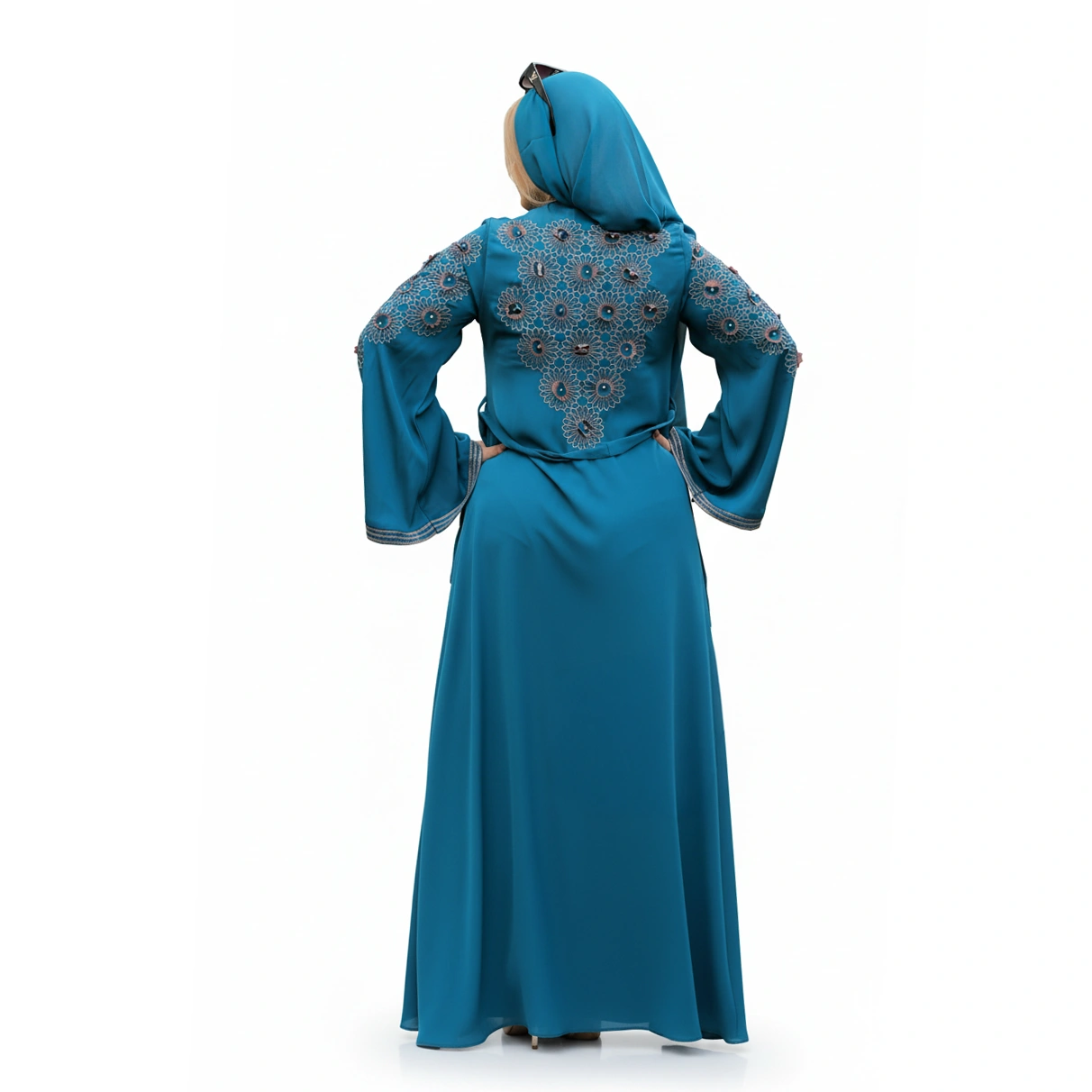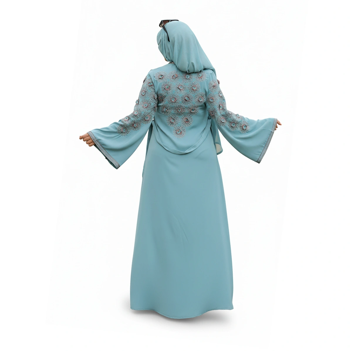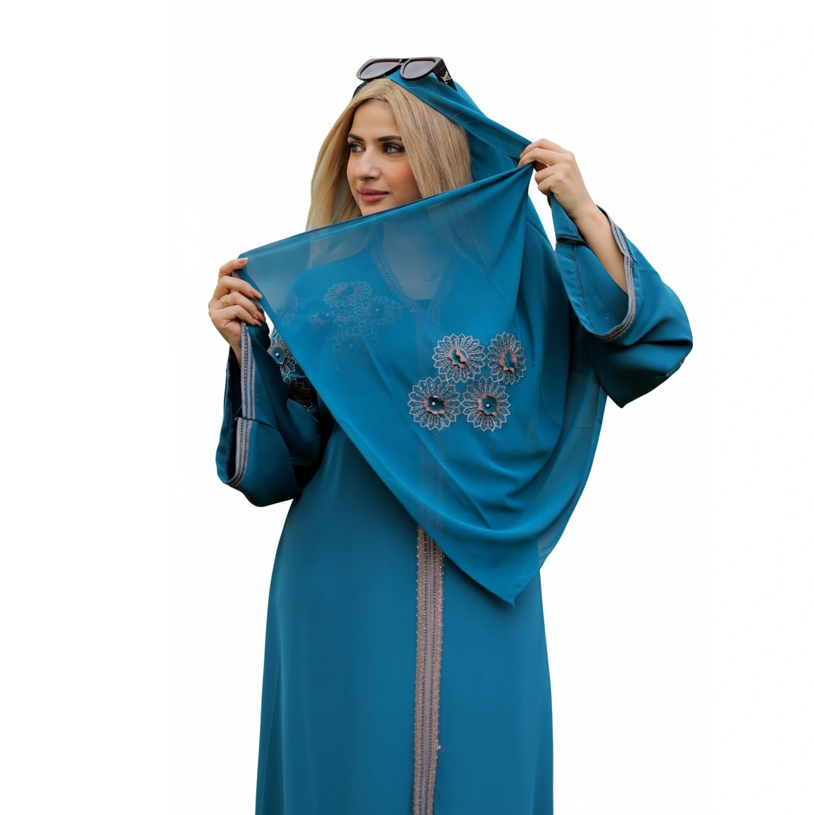 Luxury Silk Floral Embroidered Abaya with Matching Sheilah – Elegant Modest Design in premium silk. Available in Turquoise, Red, Navy, Dusty Mauve and more.