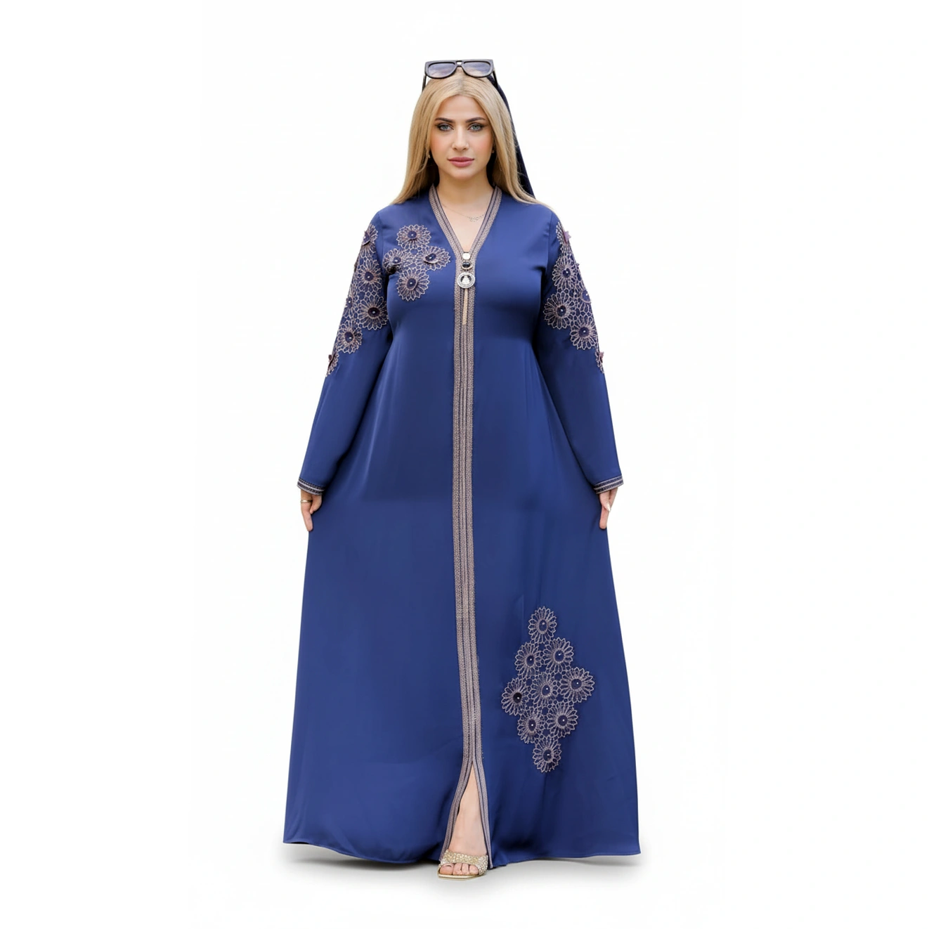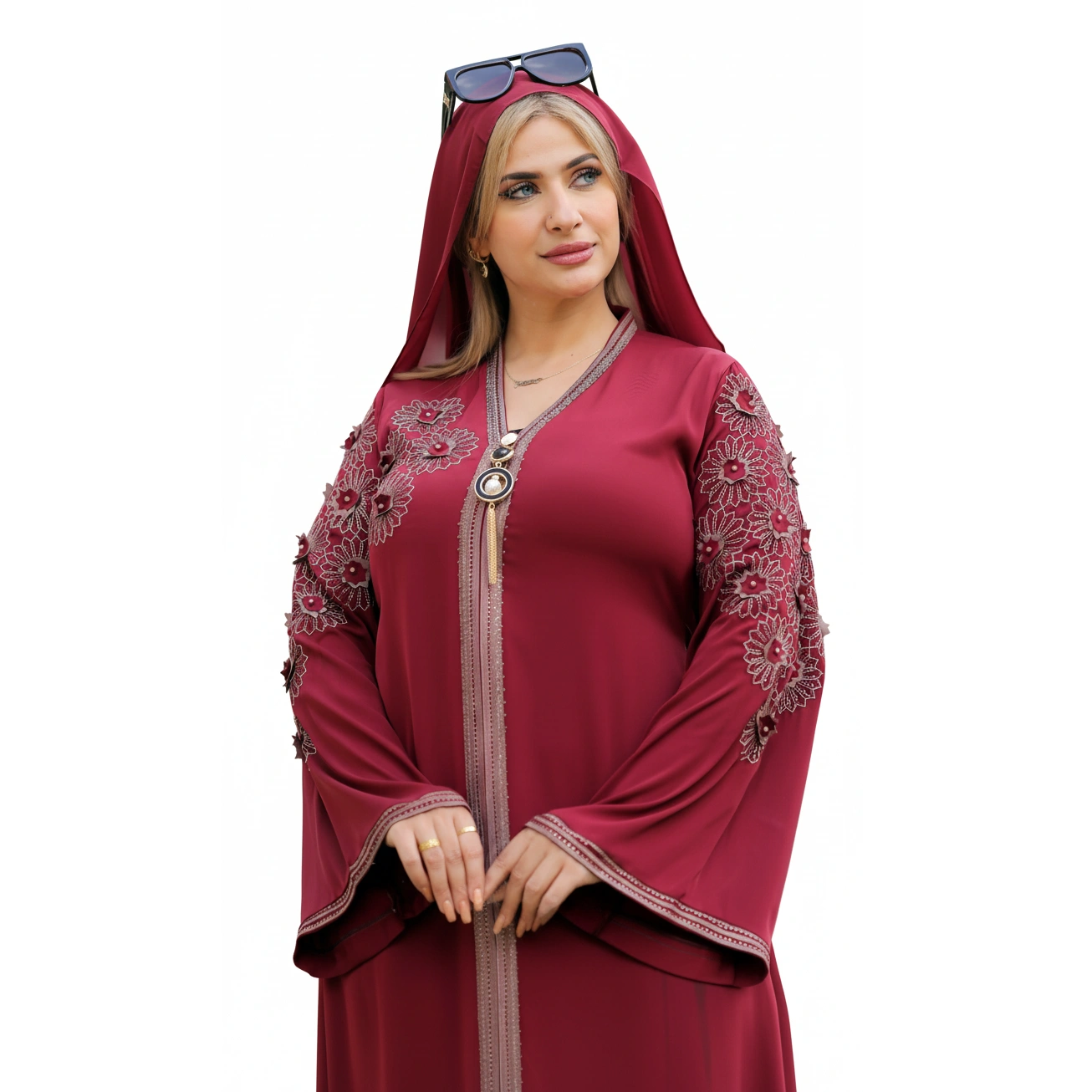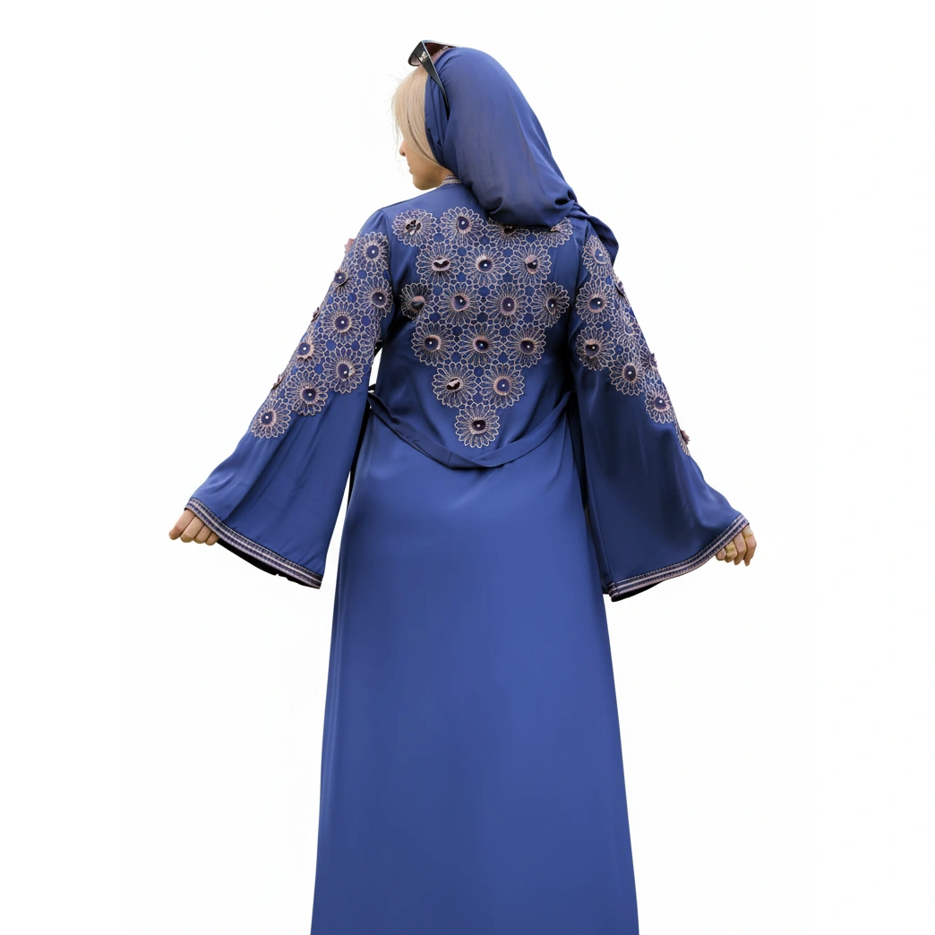 Luxury Silk Floral Embroidered Abaya with Matching Sheilah – Elegant Modest Design in premium silk. Available in Turquoise, Red, Navy, Dusty Mauve and more.
