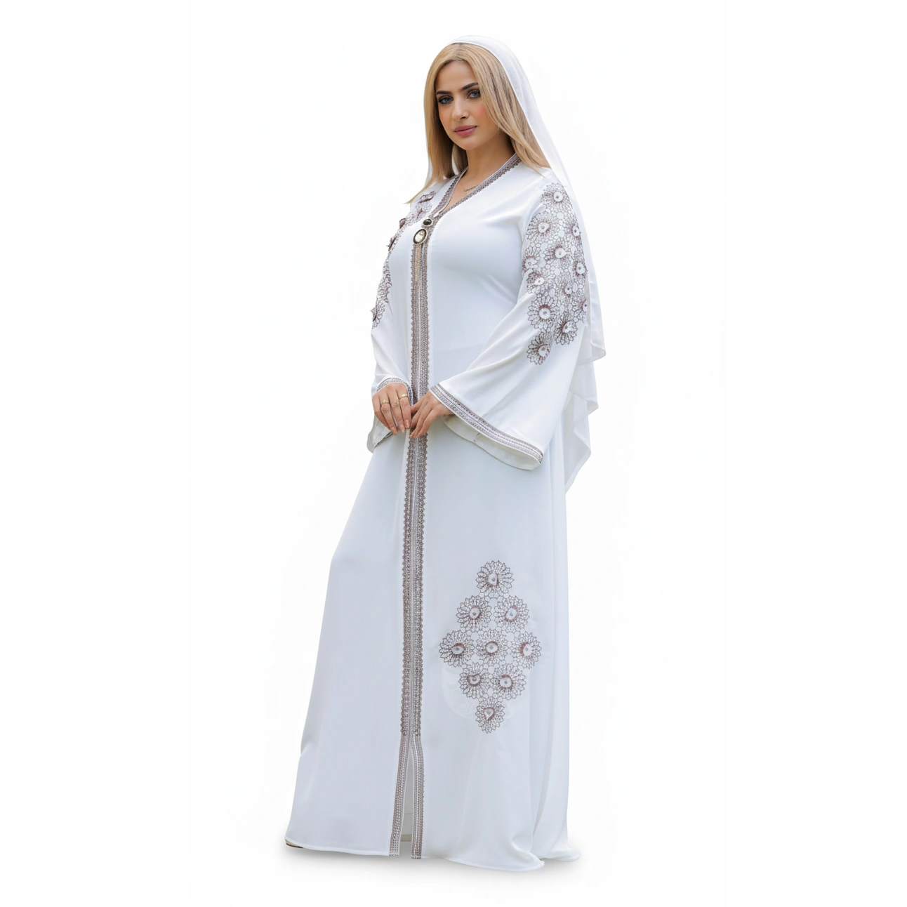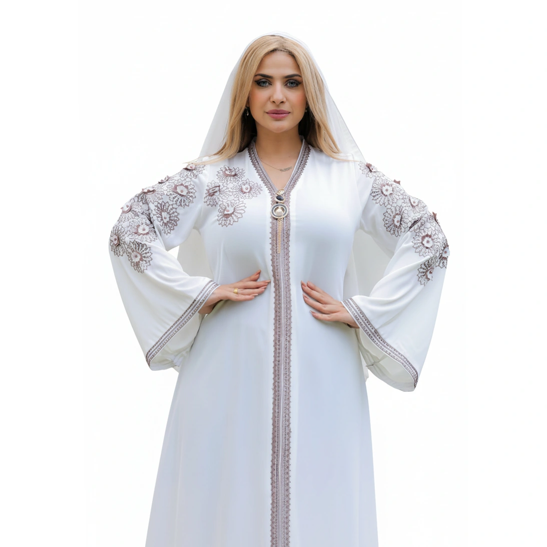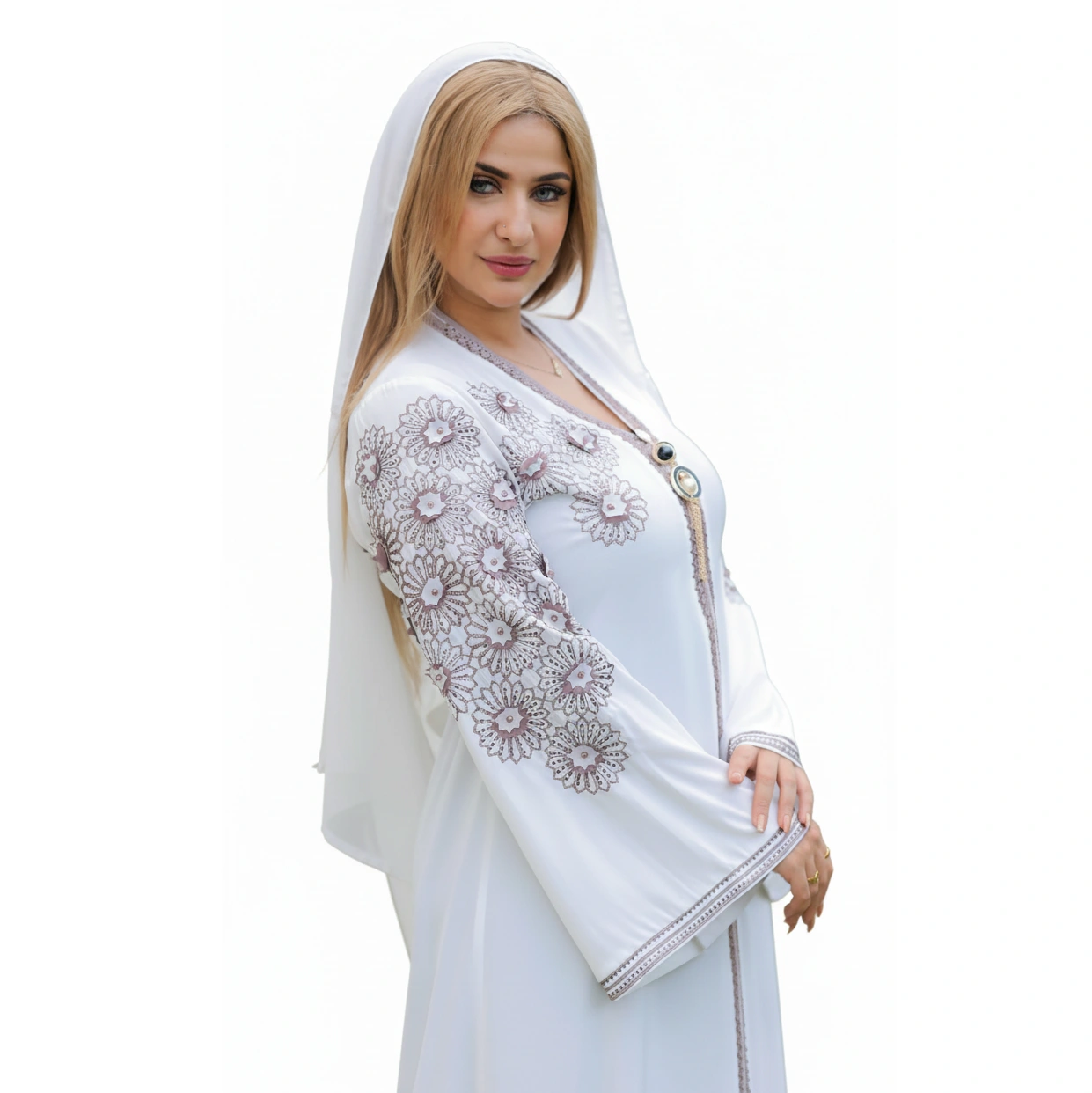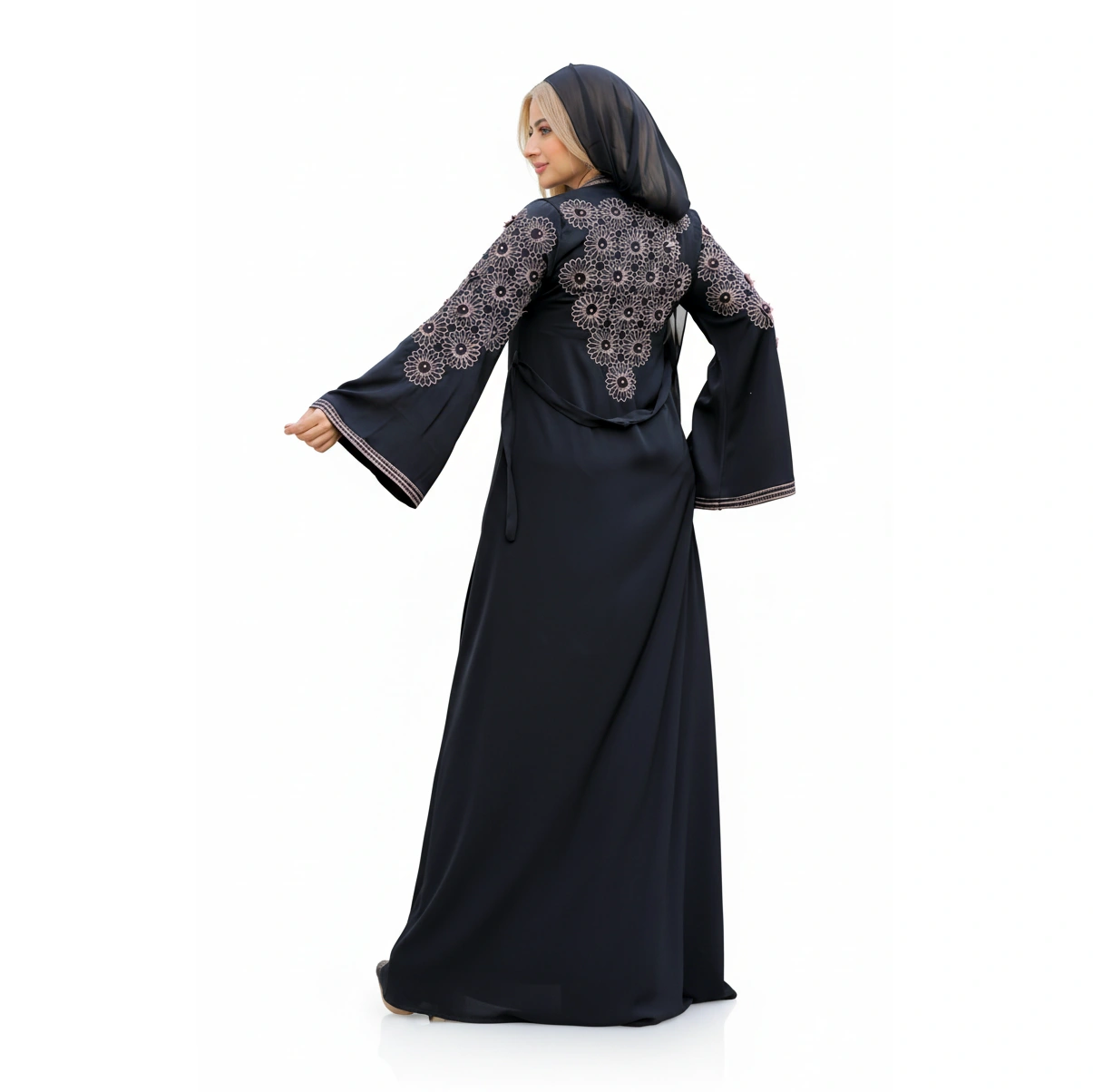 Luxury Silk Floral Embroidered Abaya with Matching Sheilah – Elegant Modest Design in premium silk. Available in Turquoise, Red, Navy, Dusty Mauve and more.