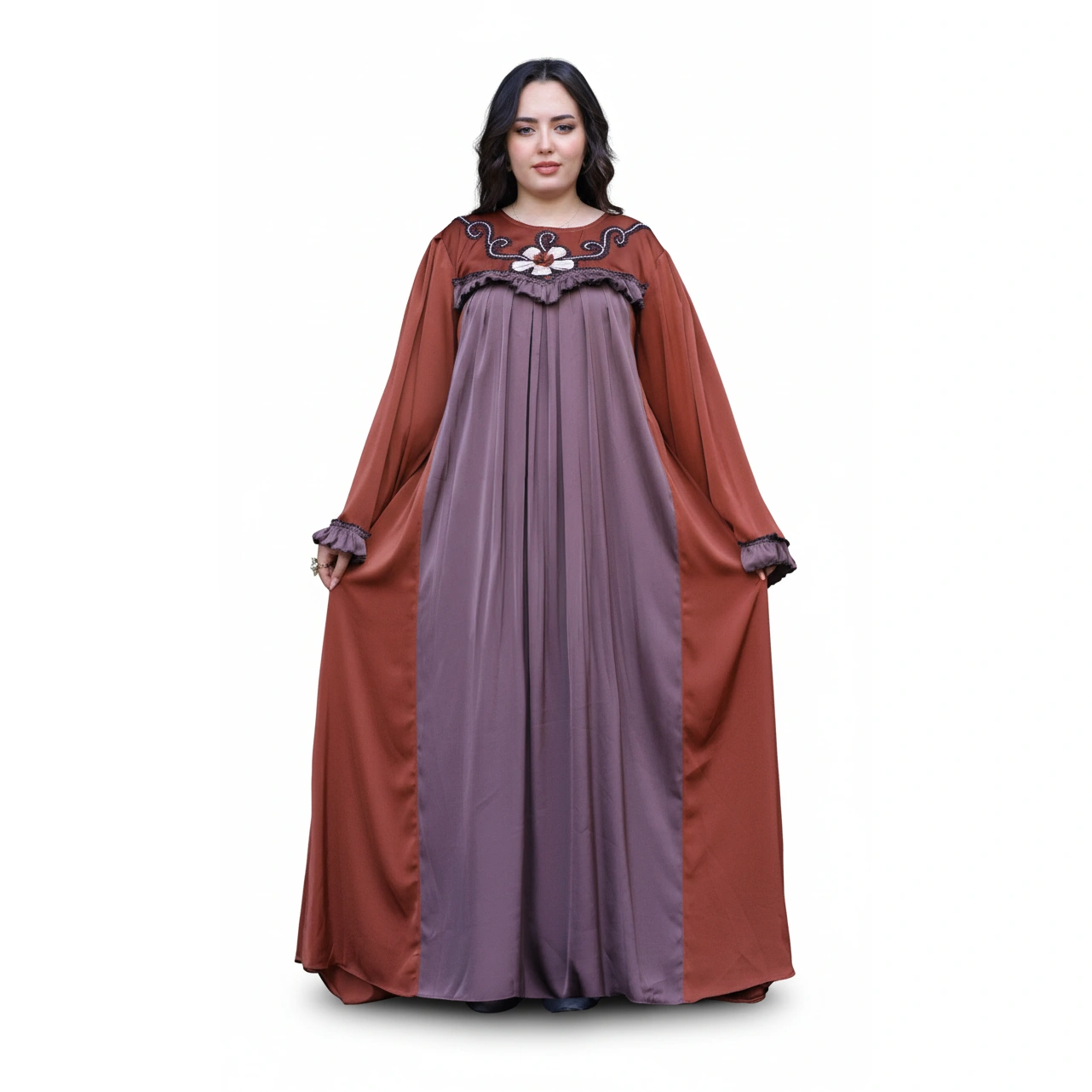 A luxurious silk pleated abaya with elegant chest embroidery. Available in Off-white and Burgundy.