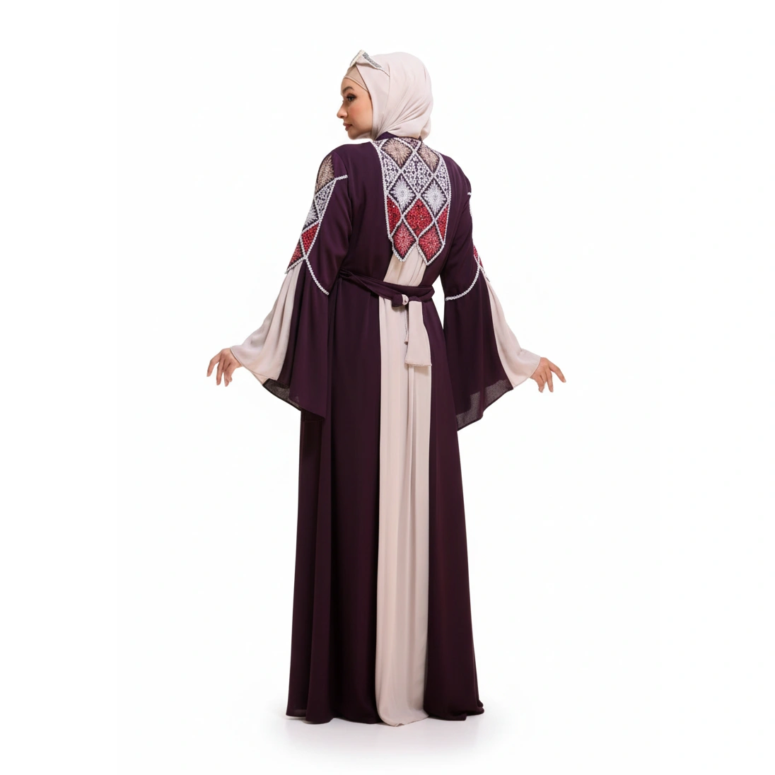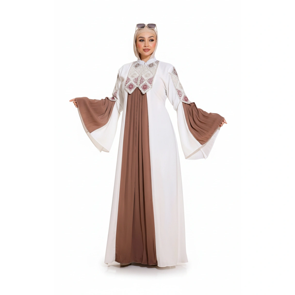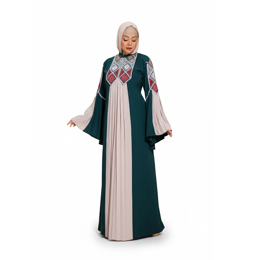 Luxury Two-Tone Silk Embroidered Abaya – Heritage Inspired Elegant Abaya in premium silk. Available in Turquoise, Teal, Rust Brown, Off-white and more. Siz.