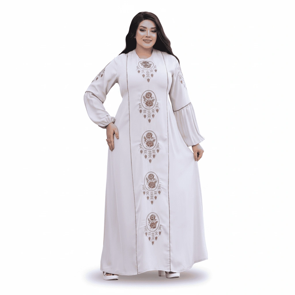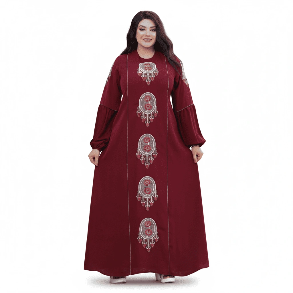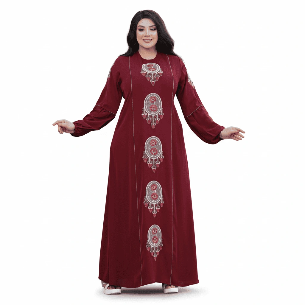 Elegant closed-front abaya, a timeless and high-demand shade that conveys luxury and confidence. The color is bold yet refined, performing exceptionally well in product photography, ads, and catalogs. Crafted from premium silk fabric, the abaya features a smooth, fluid drape that enhances comfort and elegance. The design is elevated by vertical ornamental embroidery running down the front, composed of symmetrical oval motifs with intricate floral and metallic detailing. This vertical layout elongates the silhouette, making it flattering for all body types. The sleeves are finished with subtle embroidery accents, adding balance and cohesion to the overall design. A perfect choice for customers seeking a standout piece that remains modest, practical, and commercially strong.