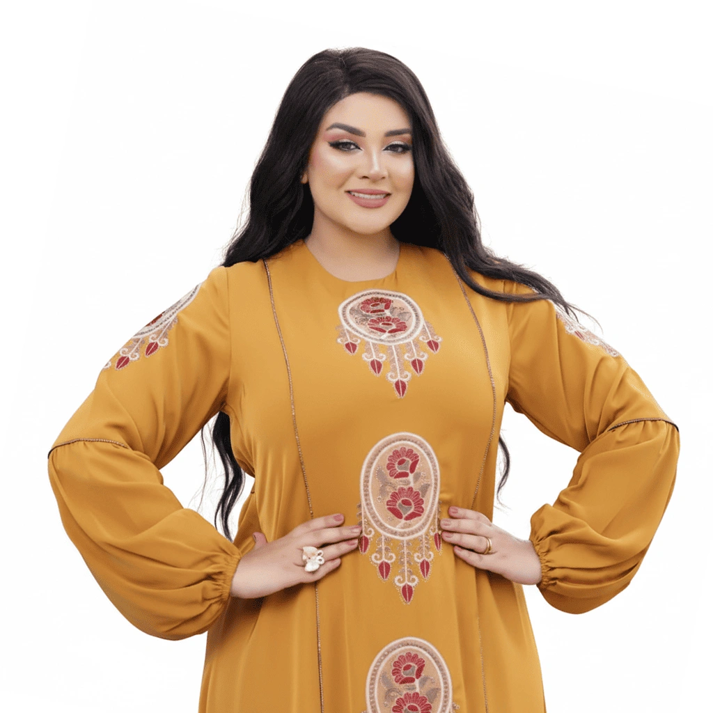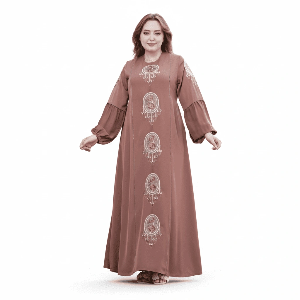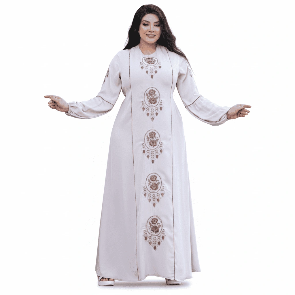 Elegant closed-front abaya, a timeless and high-demand shade that conveys luxury and confidence. The color is bold yet refined, performing exceptionally well in product photography, ads, and catalogs. Crafted from premium silk fabric, the abaya features a smooth, fluid drape that enhances comfort and elegance. The design is elevated by vertical ornamental embroidery running down the front, composed of symmetrical oval motifs with intricate floral and metallic detailing. This vertical layout elongates the silhouette, making it flattering for all body types. The sleeves are finished with subtle embroidery accents, adding balance and cohesion to the overall design. A perfect choice for customers seeking a standout piece that remains modest, practical, and commercially strong.